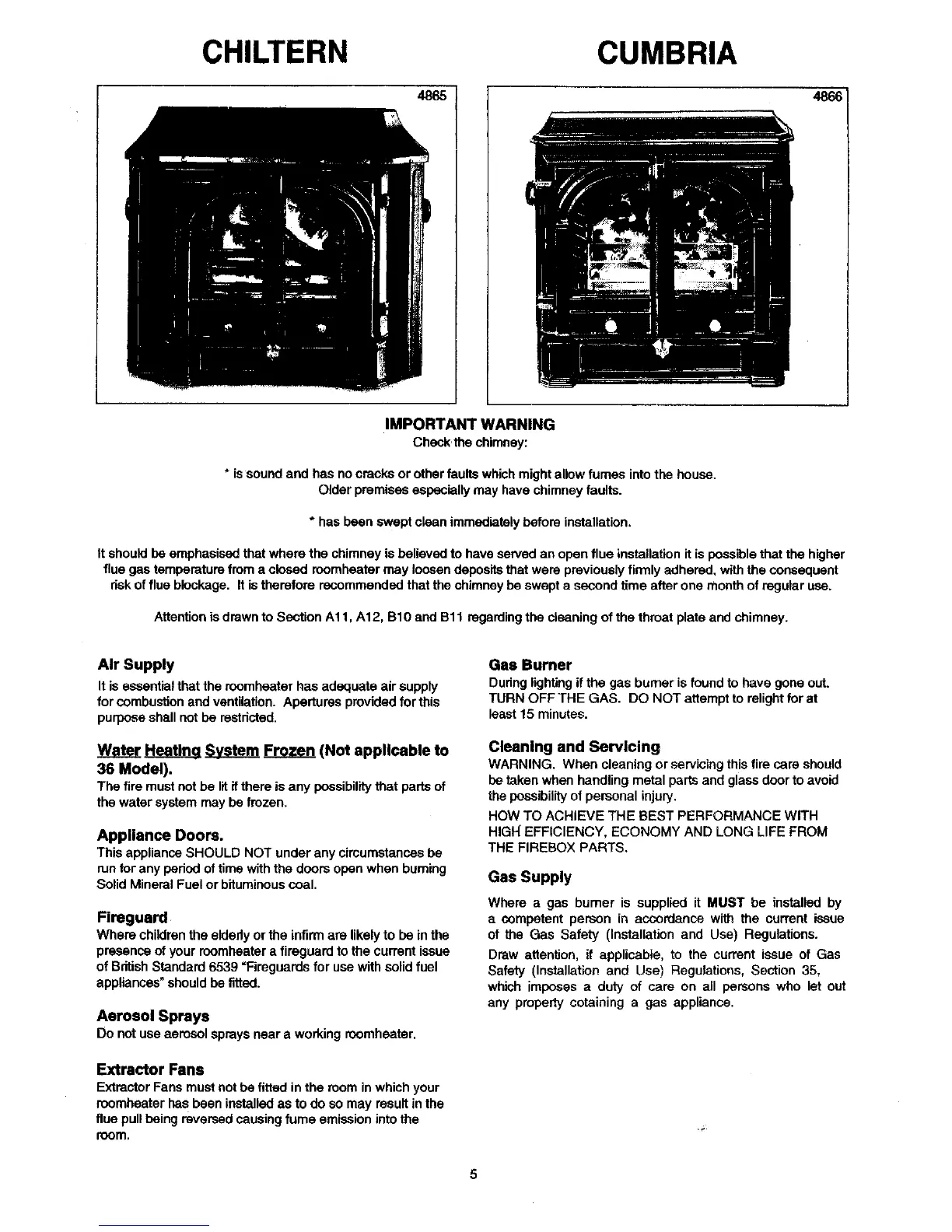 Parkray Chiltern - Important Safety Warnings; Air Supply; Water Heating System Frozen; Appliance Doors