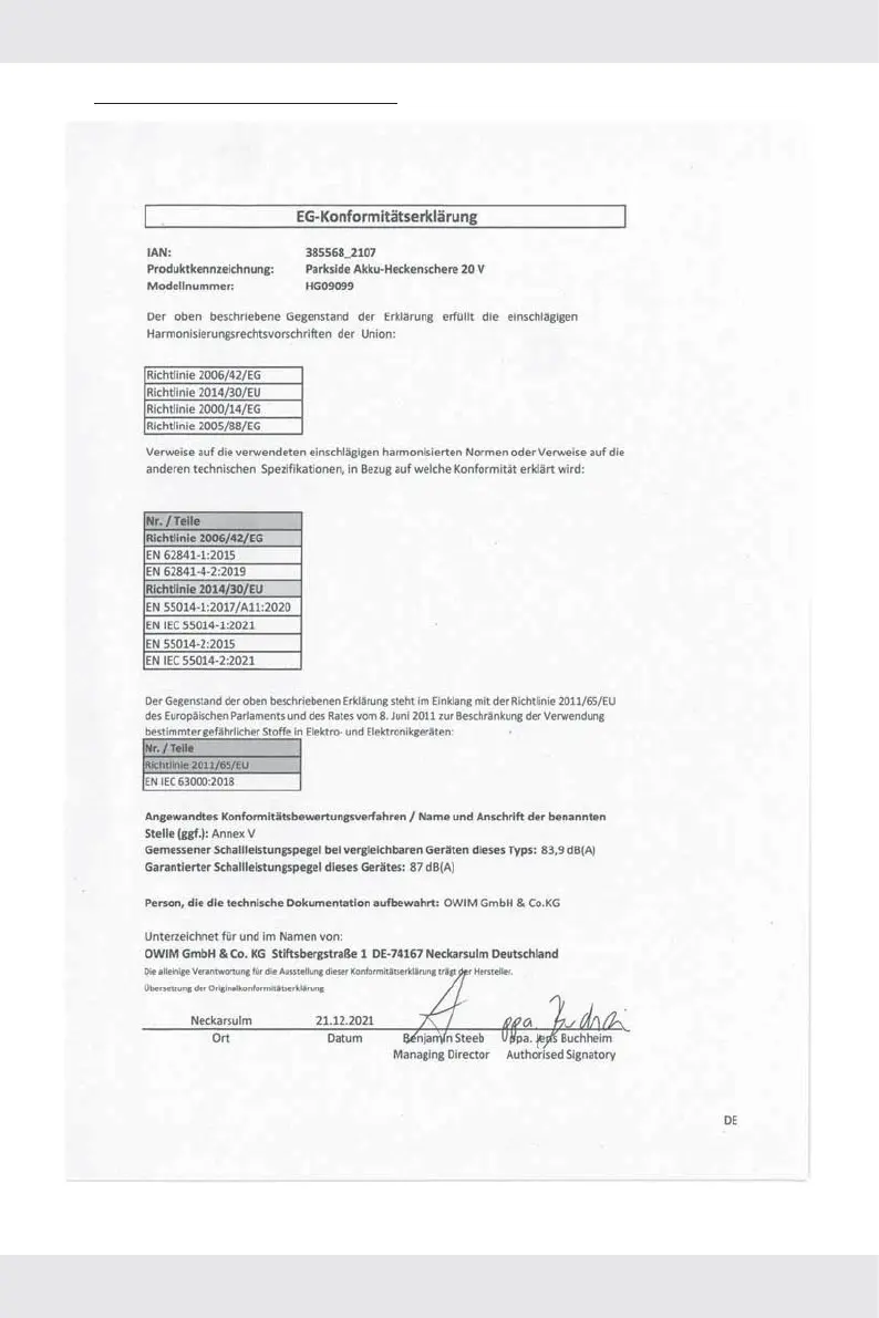 Parkside PHSA 20-Li B2 - EG-Konformitätserklärung