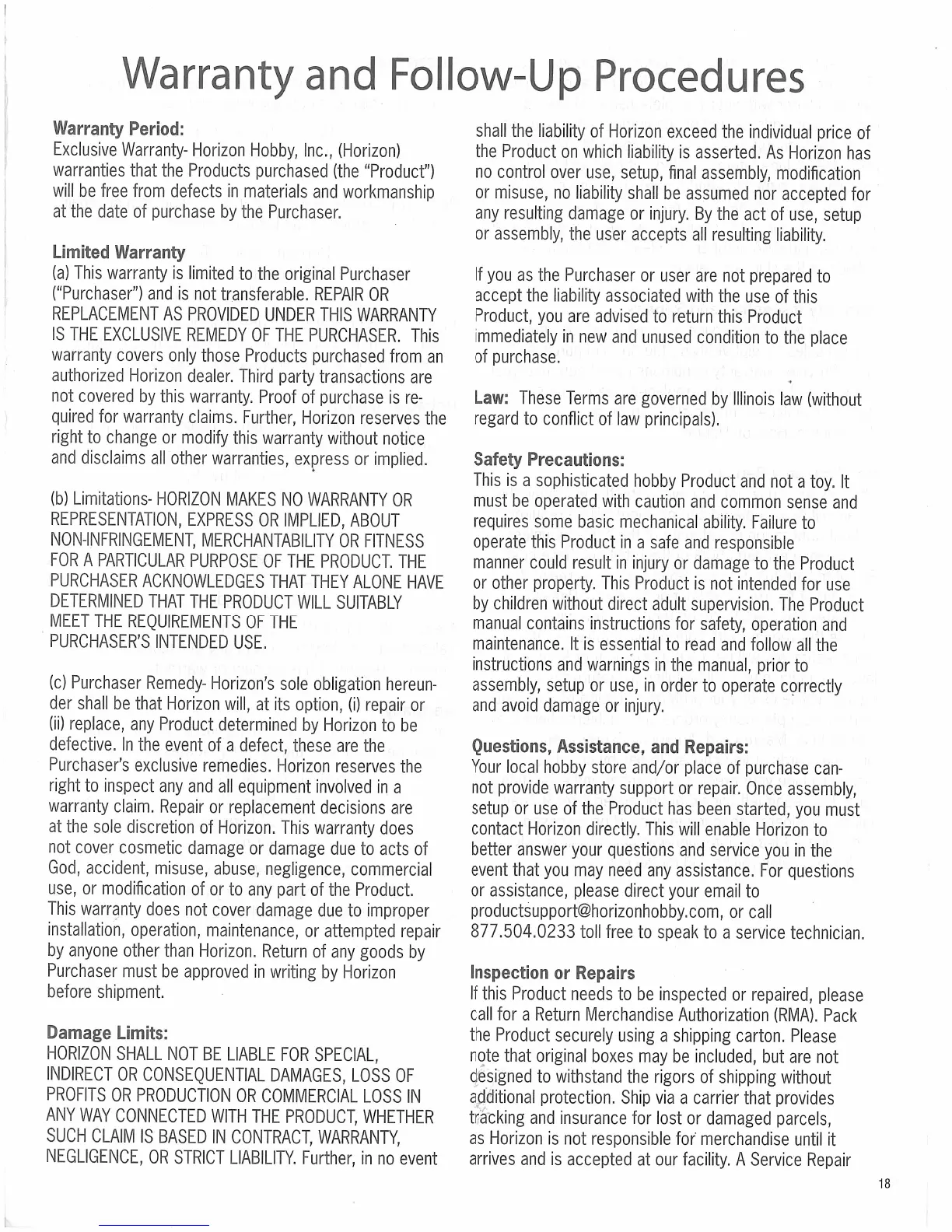 PARKZONE Radian - Warranty and Support; Warranty Details; Liability and Damage Limits; Safety Precautions