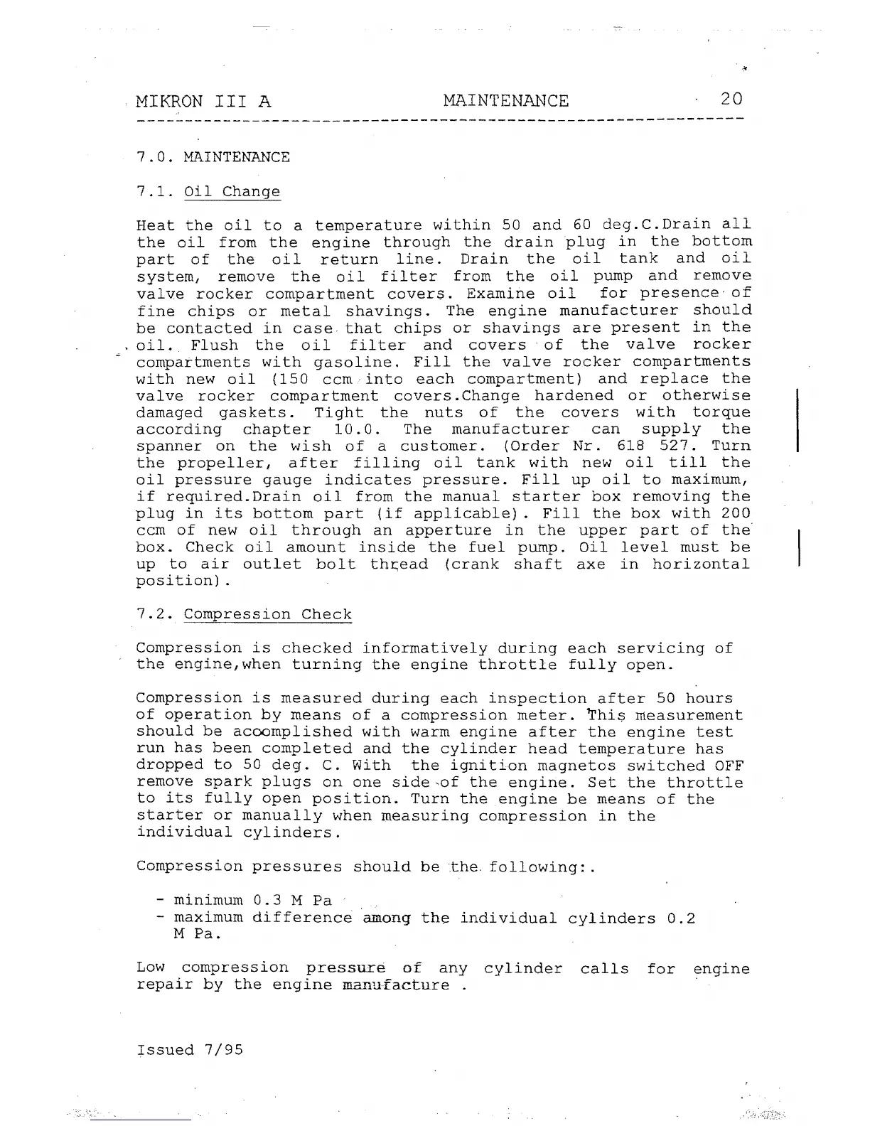 PARMA-TECHNIK MIKRON III A - 7.0 MAINTENANCE; 7.1 Oil Change; 7.2 Compression Check
