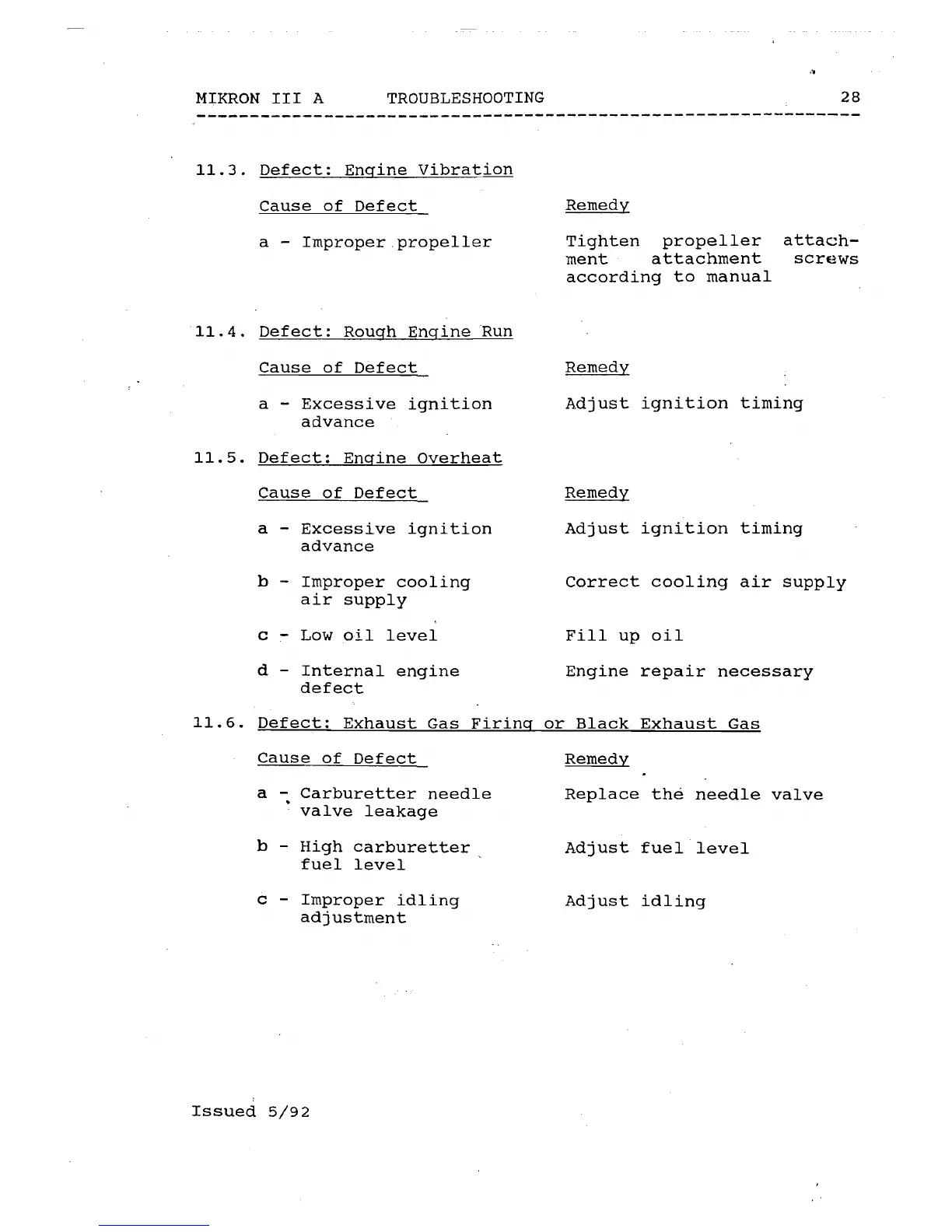 PARMA-TECHNIK MIKRON III A - 11.3 Defect: Engine Vibration; 11.4 Defect: Rough Engine Run; 11.5 Defect: Engine Overheat; 11.6 Defect: Exhaust Gas Firing or Black Exhaust Gas