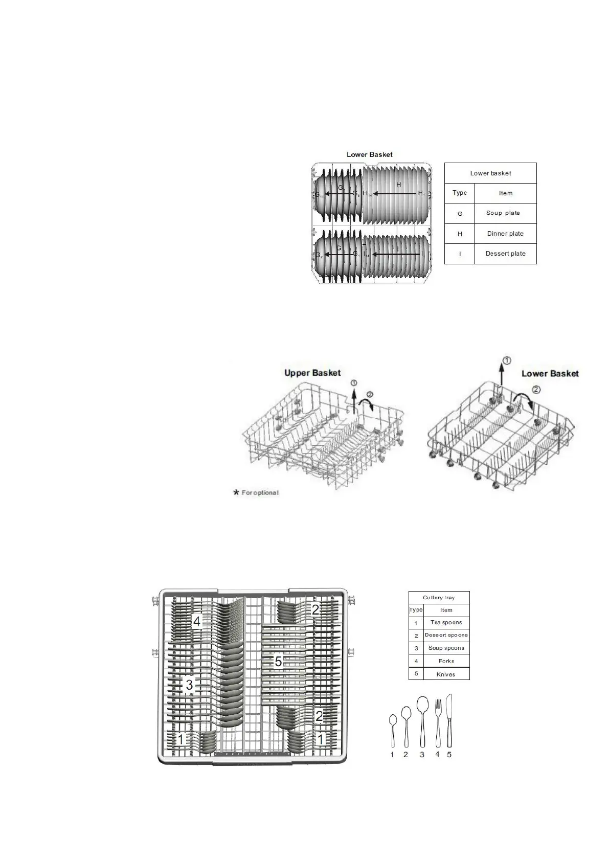 Arrange the cutlery in the tray as shown. Cutlery should be placed to ensure that water runs