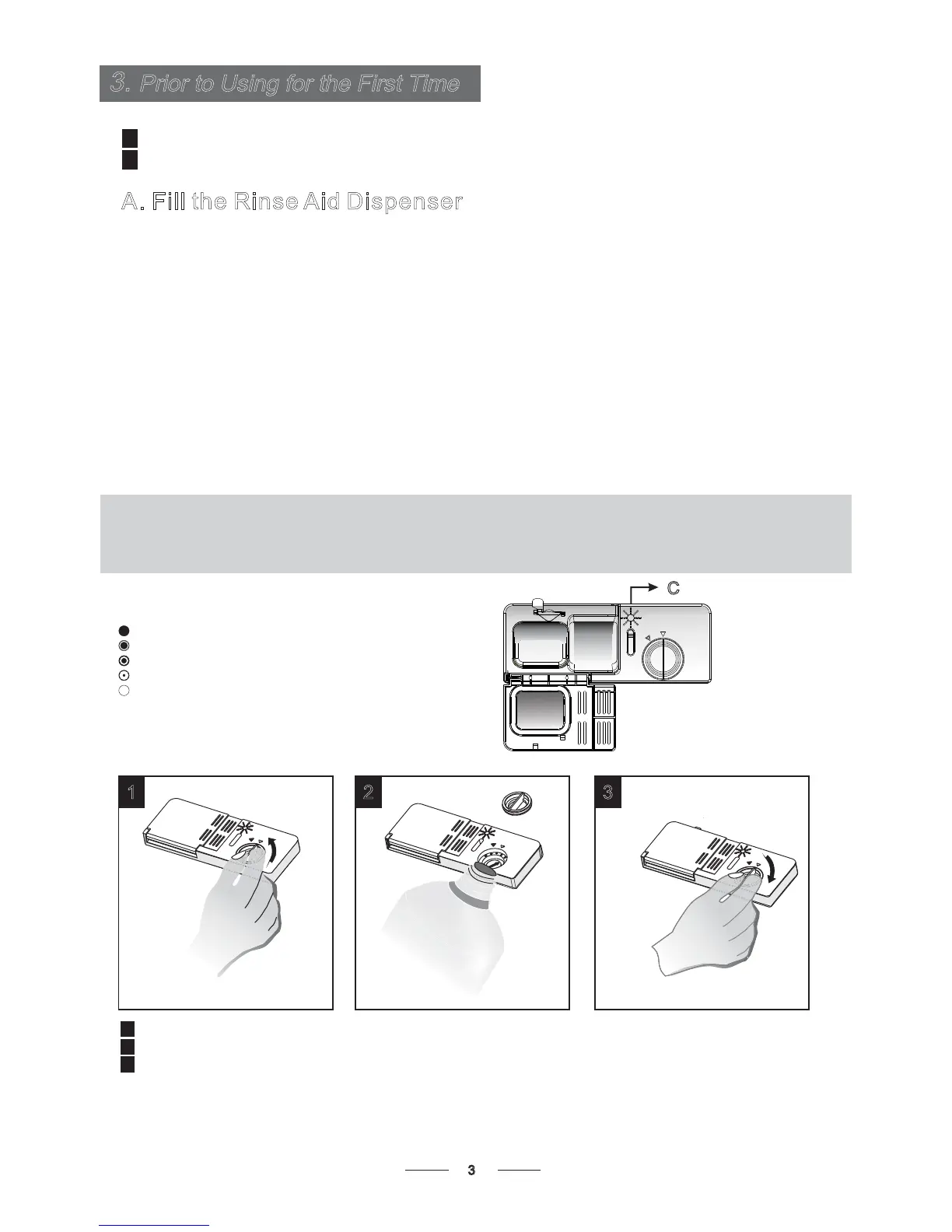 optical level indicator "C" located next to the cap. When the rinse aid container is full, the whole indicator will be