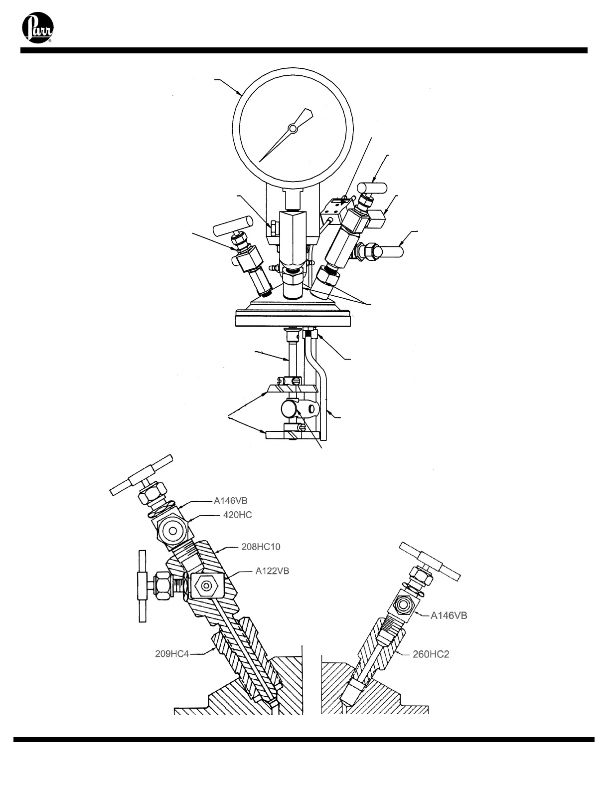 parr 4520 - Pressure Gauge and Thermowell Identification; Stirrer Shaft Assembly Identification; Adapter Bushings and Fittings Identification