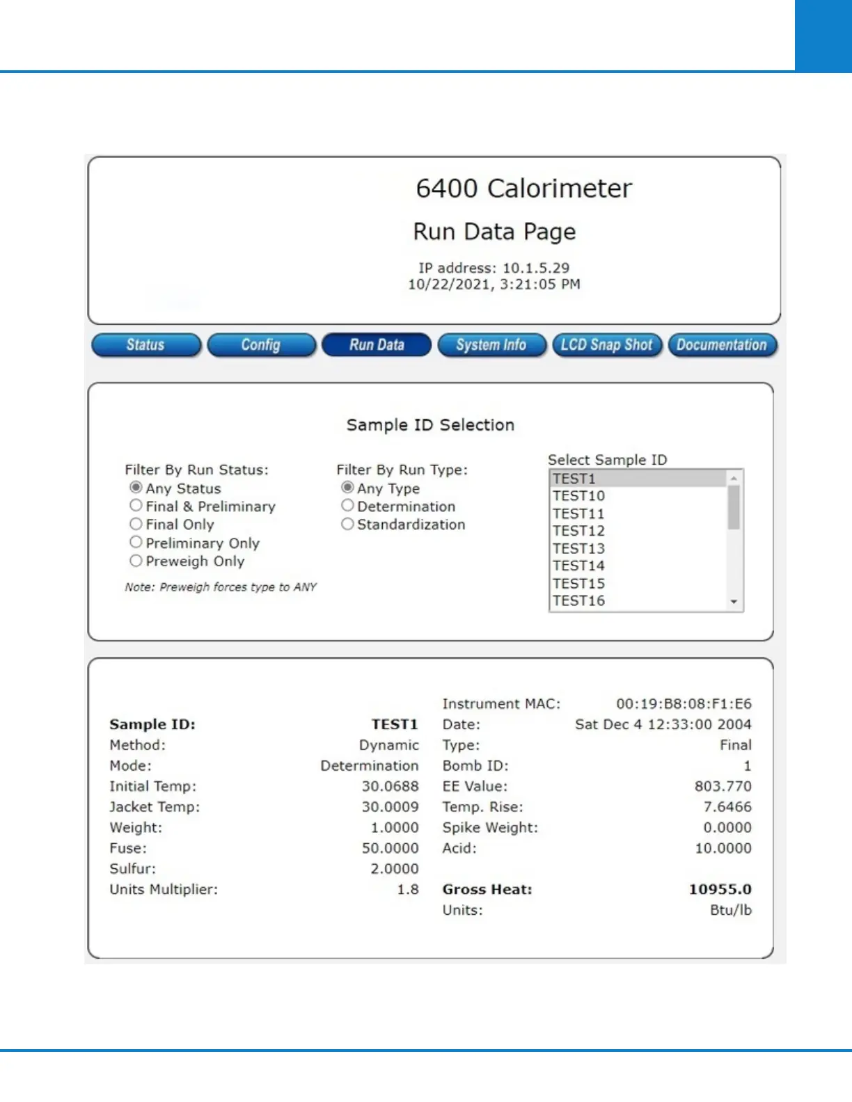 Clicking on the Run Data button displays a list of reports currently in the instrument memory.