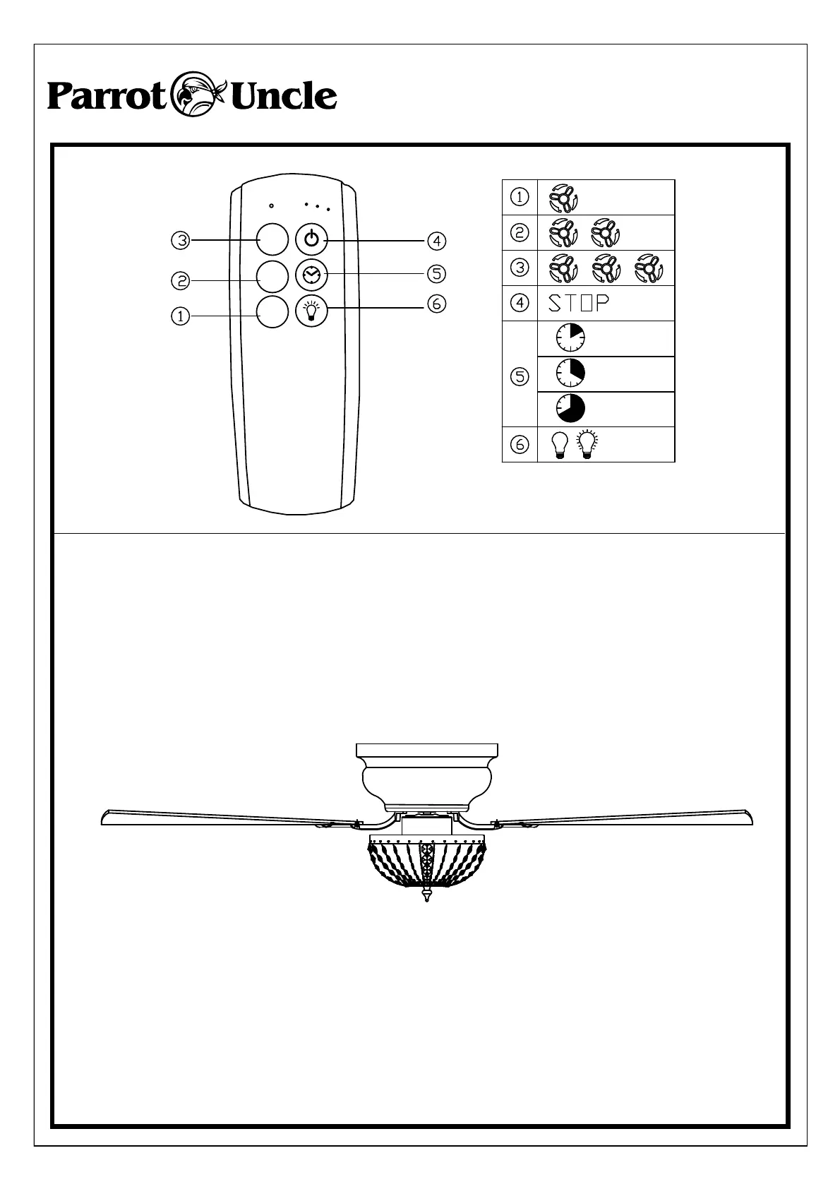 Parrot Uncle F6233 - Remote Control Functions; Fan Speed Settings; Light Operation; Emergency Stop