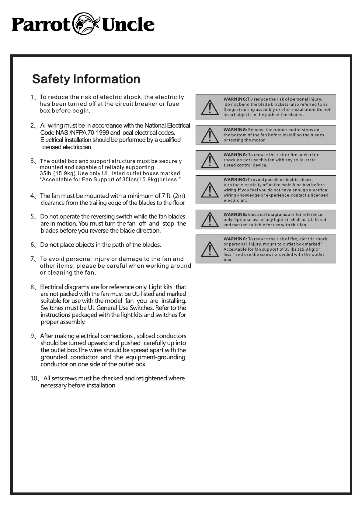 Parrot Uncle F8219110V - Safety Information; General Safety and Installation Warnings