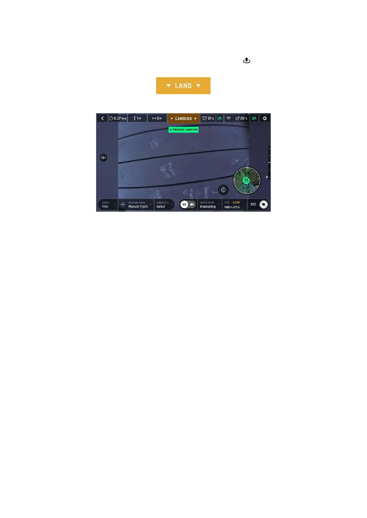 Fly ANAFI USA directly over a flat, even, and clear surface, then press Take-off/Land, or tap the