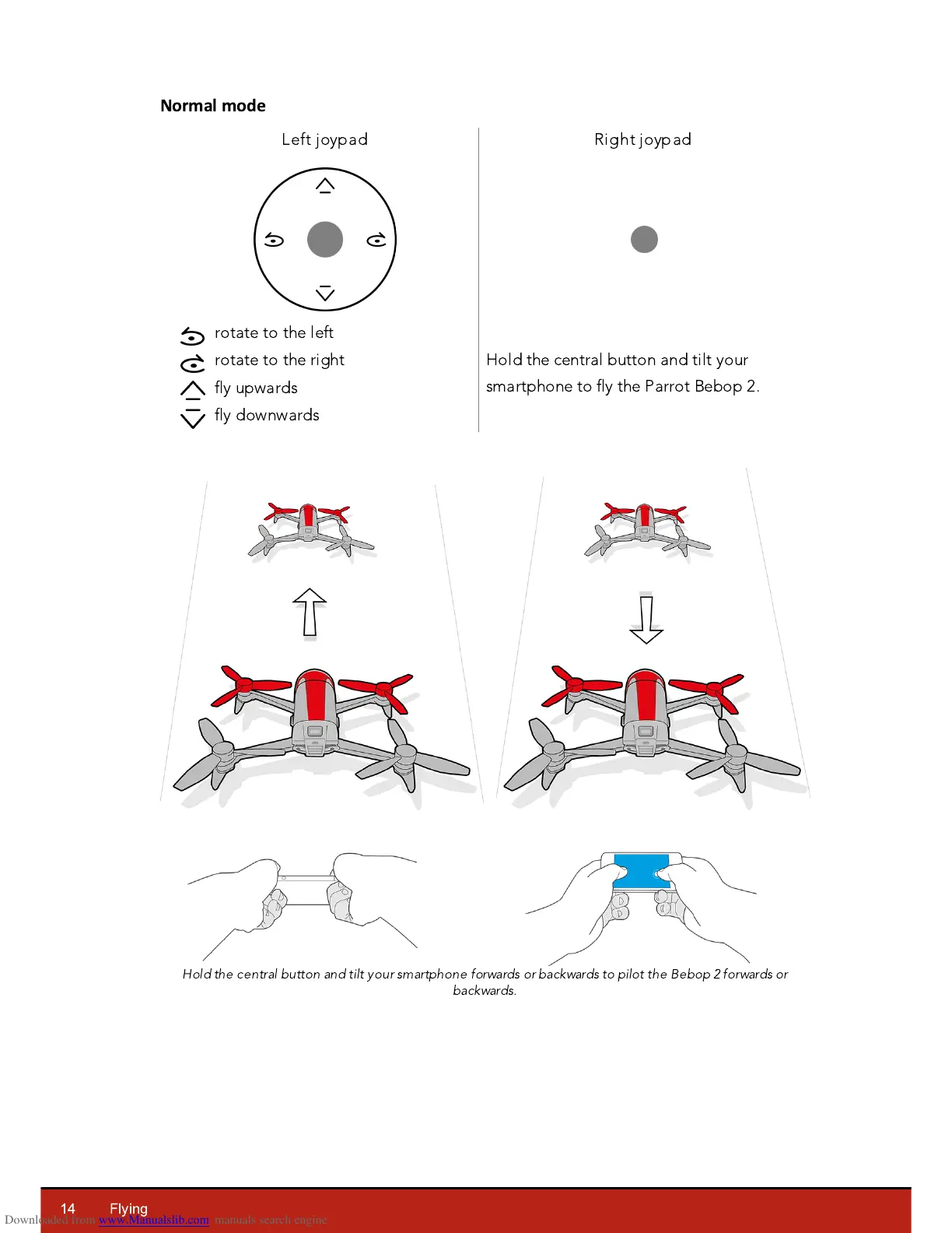 Hold the central button and tilt your smartphone forwards or backwards to pilot the Bebop 2 forwards or