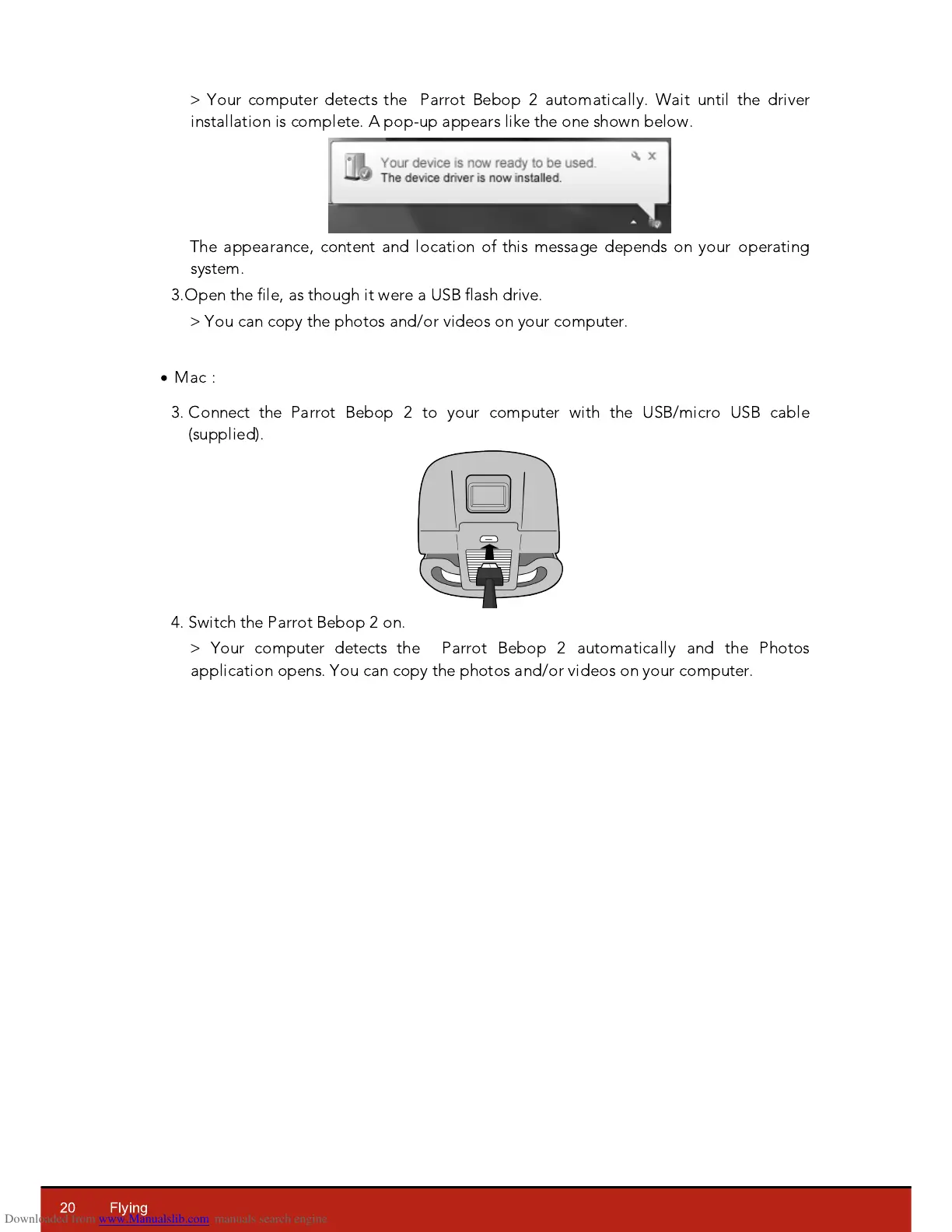 3. Connect the Parrot Bebop 2 to your computer with the USB/micro USB cable