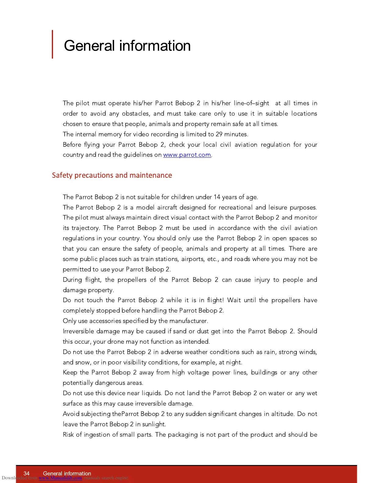 The pilot must always maintain direct visual contact with the Parrot Bebop 2 and monitor