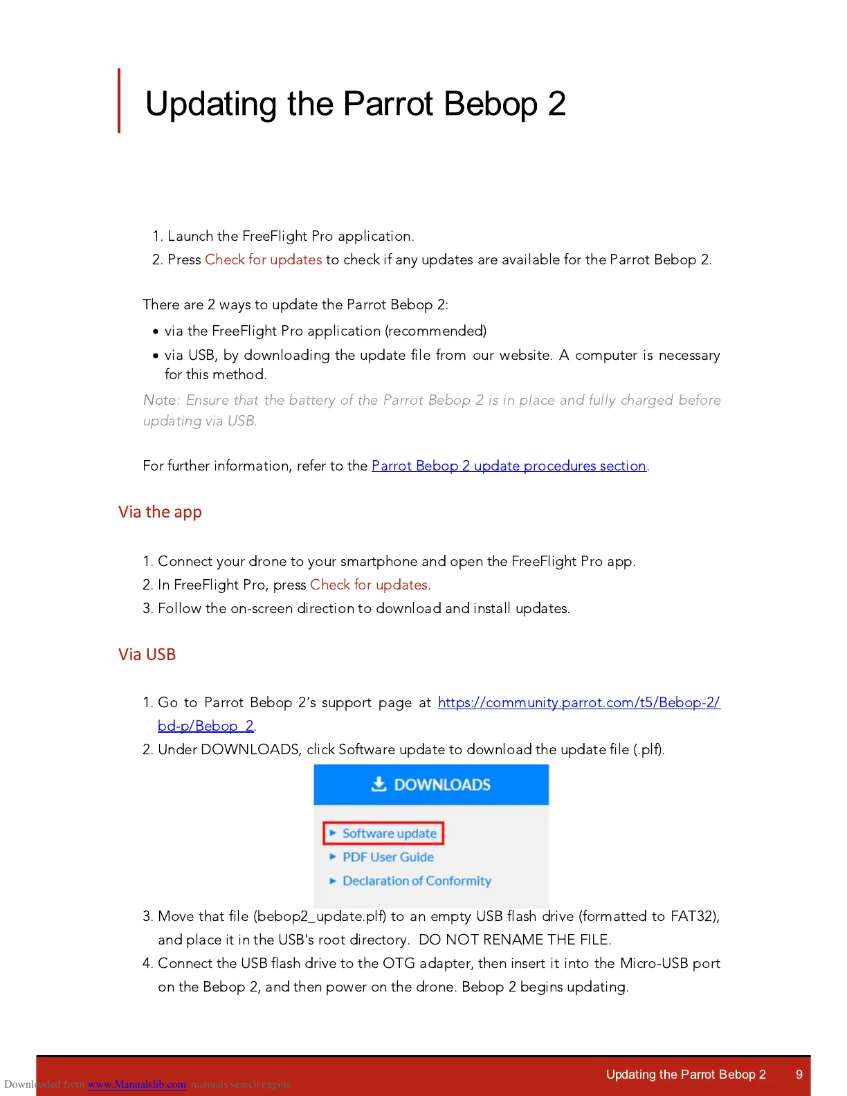 For further information, refer to the Parrot Bebop 2 update procedures section.