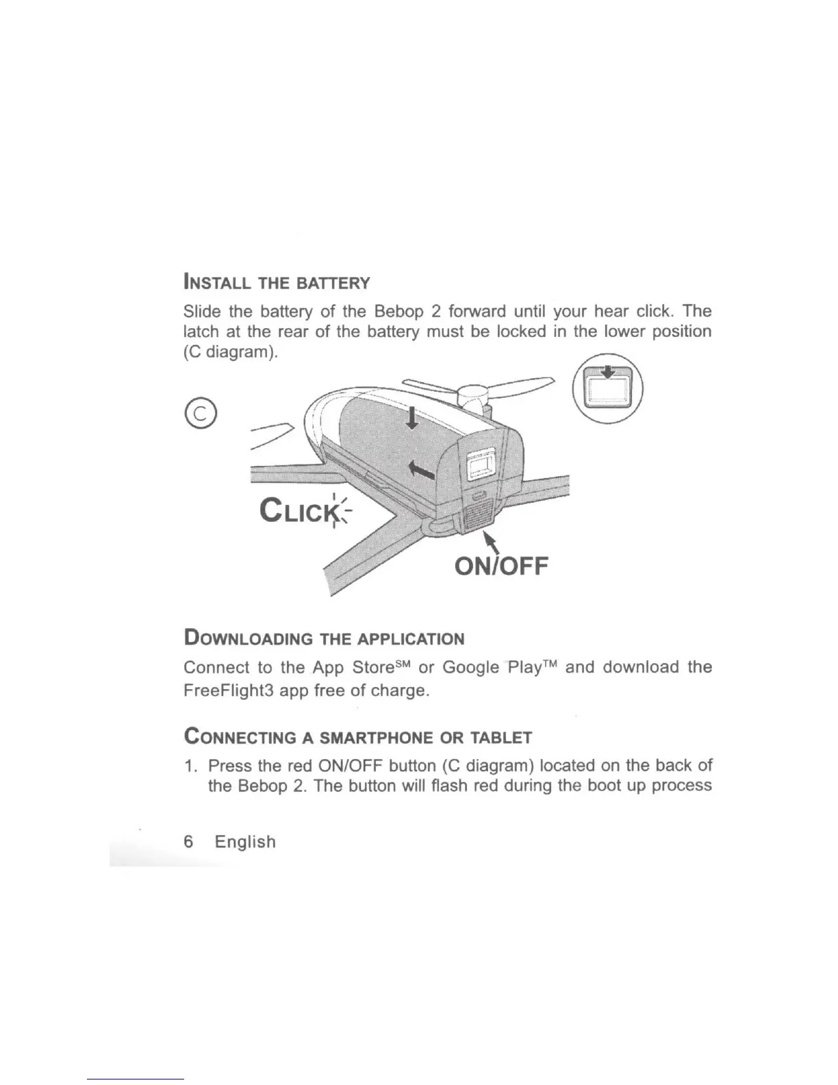 Parrot BEBOP DRONE 2 - Drone Setup Procedures; Battery Installation and App Download; Connecting Smartphone;Tablet to Drone