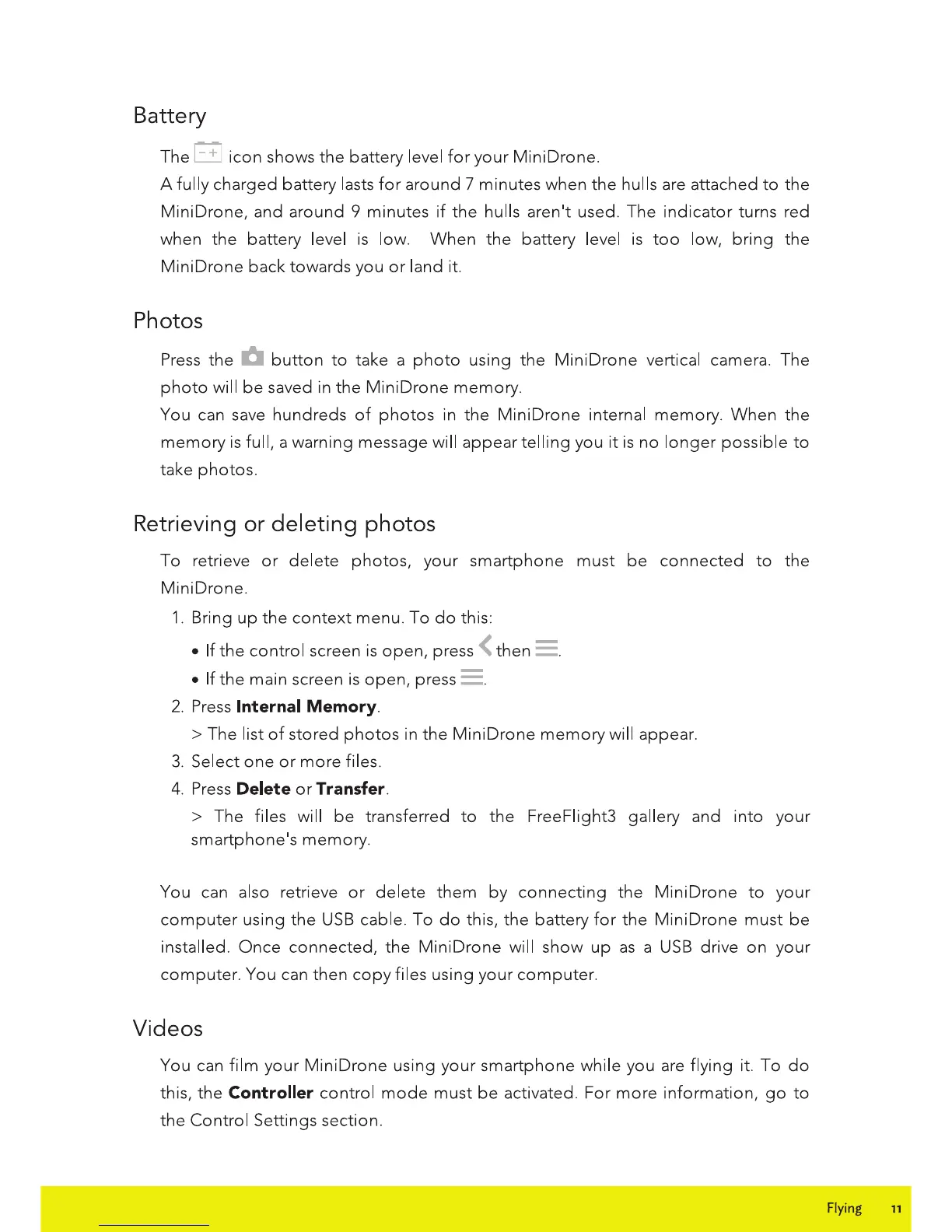 Parrot TRAVIS - Battery; Photos; Retrieving or Deleting Photos; Videos