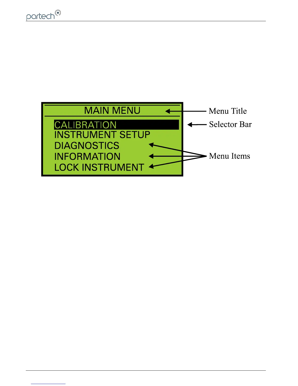 To access the main menu, press the MENU key when the instrument is in measure mode. Pressing the MENU key