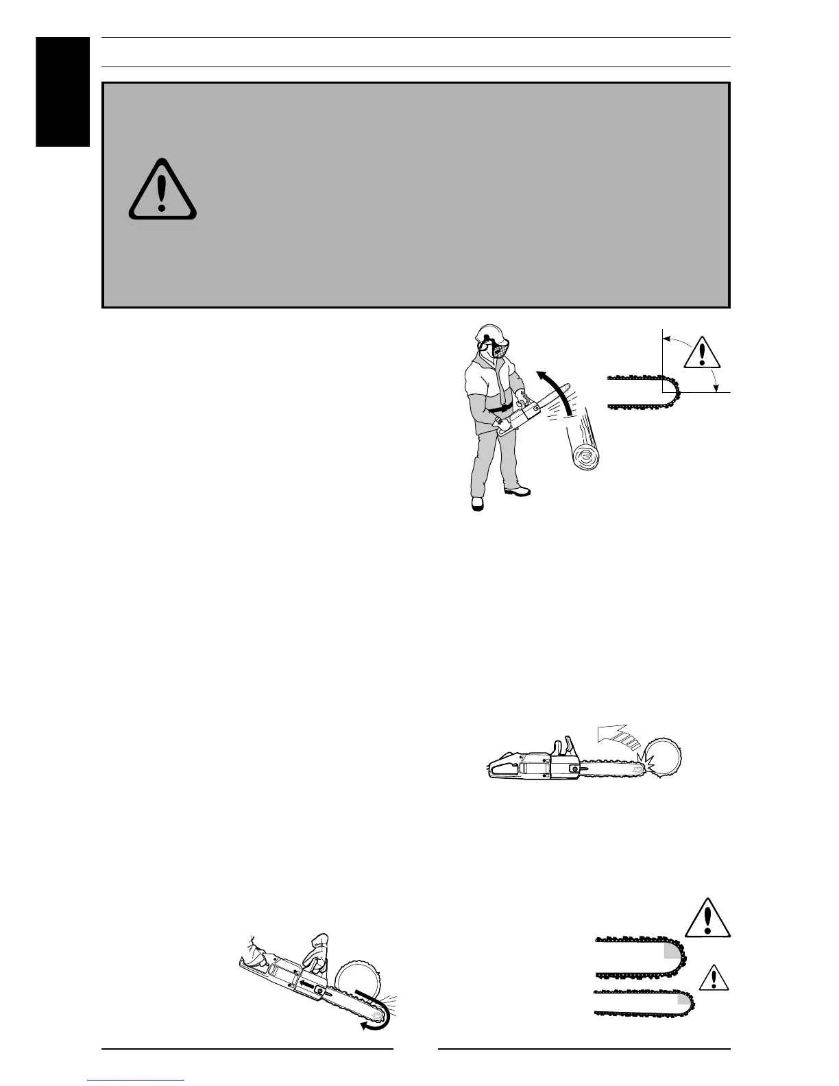 chainsaw back at the user. A running chain can infl ict severe and even fatal injury. It is imperative