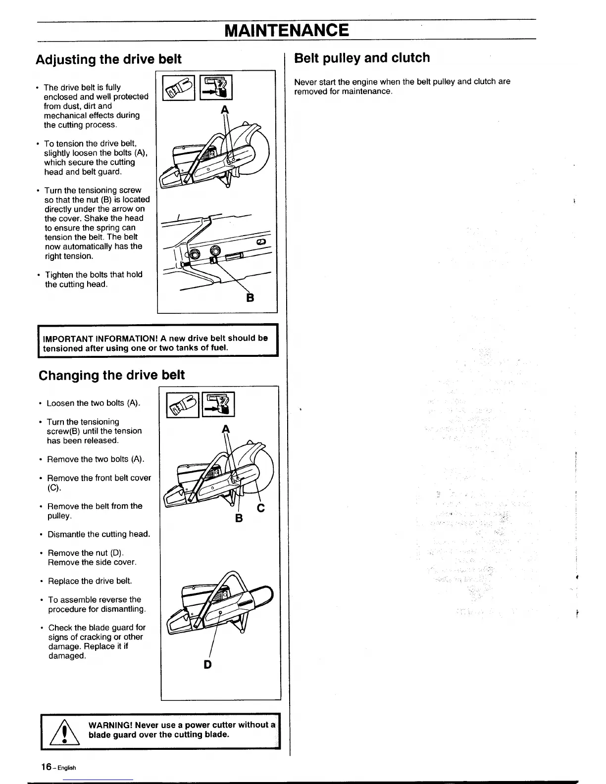 Partner K1250 Active - Maintenance: Drive Belt System; Adjusting and Changing the Drive Belt; Belt Pulley and Clutch Notes