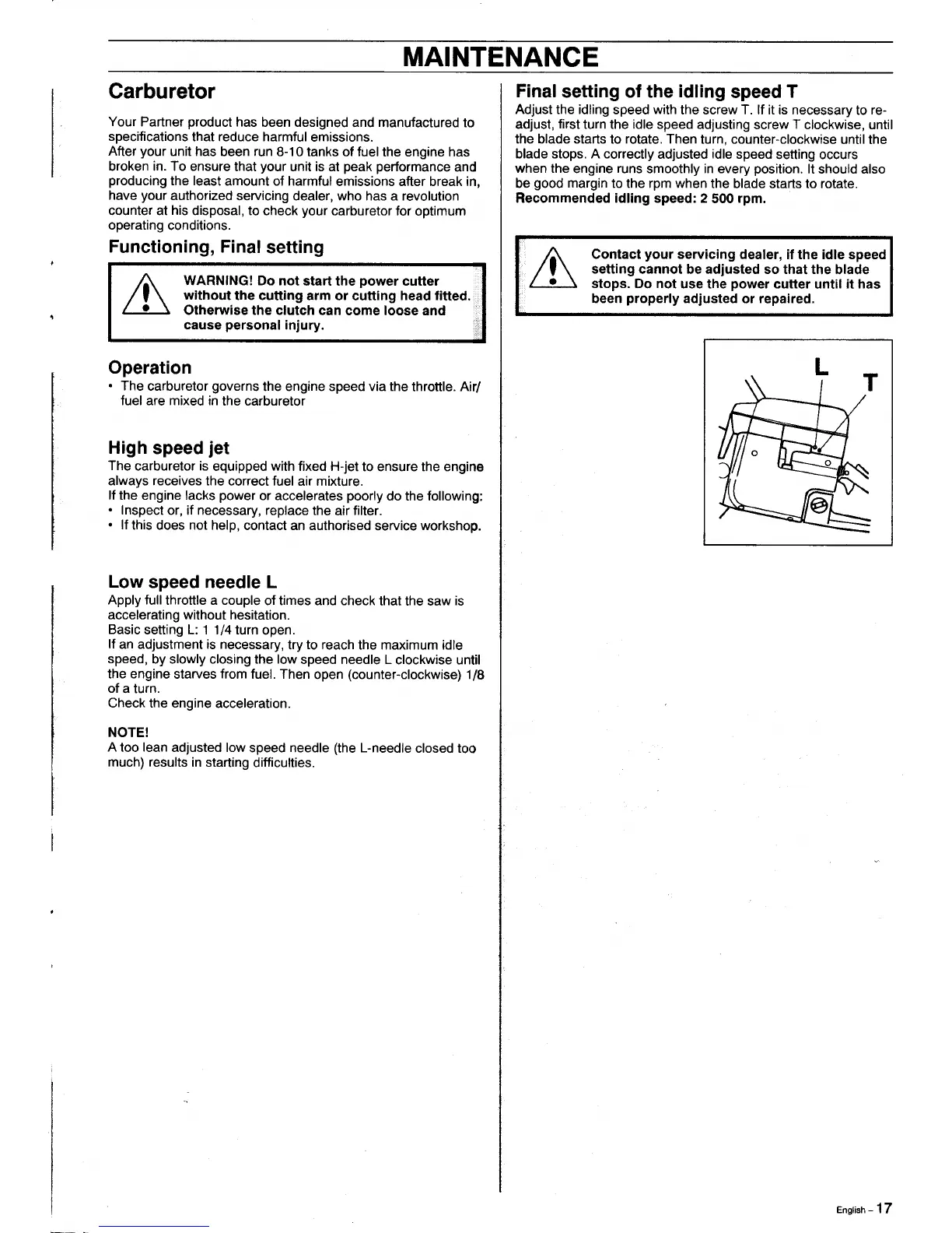 Partner K1250 Active - Maintenance: Carburetor System; Carburetor Function and Settings; Idling Speed Adjustment