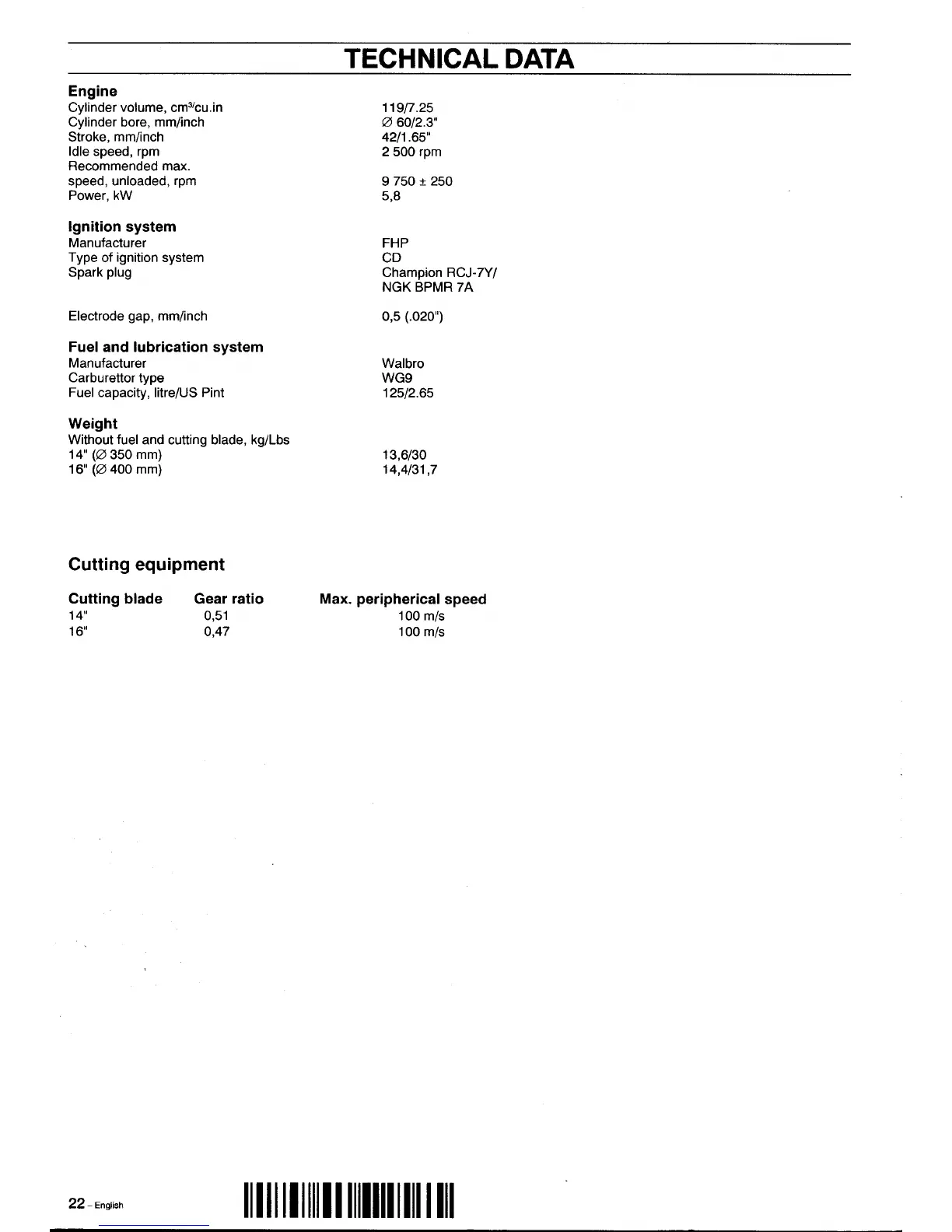 Partner K1250 Active - Technical Data and Specifications; Engine and Ignition System Details; Fuel, Lubrication, and Cutting Data