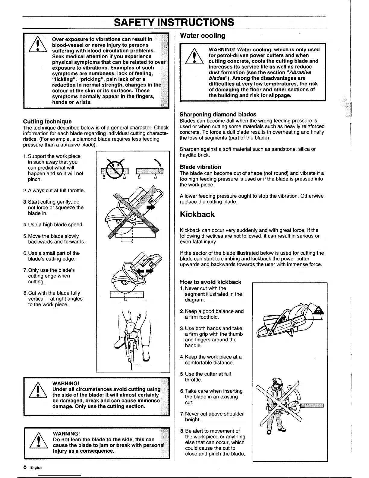 Partner K1250 Active - Cutting Techniques and Hazards; Vibration Exposure and Symptoms; Blade Handling and Kickback Avoidance; Water Cooling and Blade Sharpening