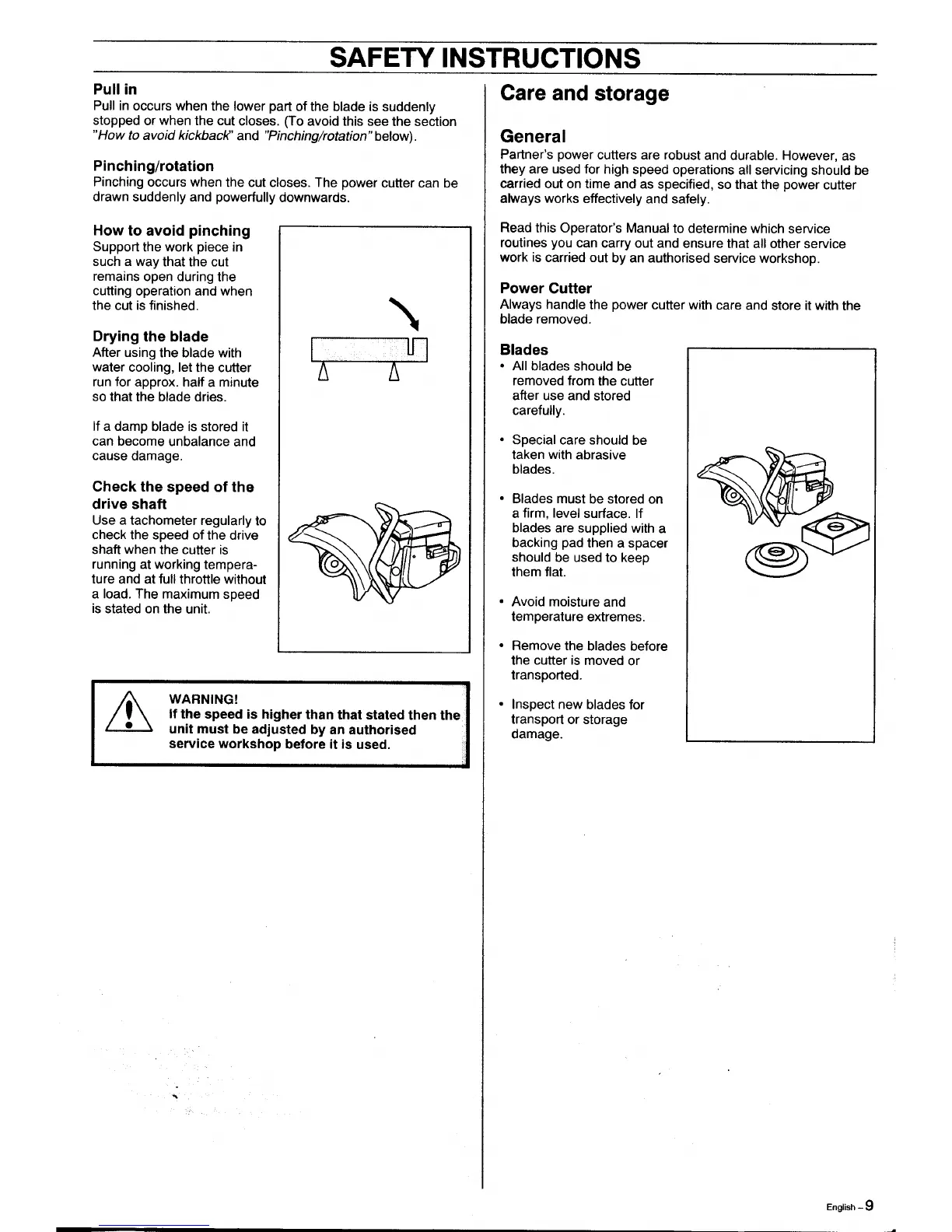 Partner K1250 Active - Operational Issues and Care; Pull-in, Pinching, and Blade Drying; Drive Shaft Speed and Storage