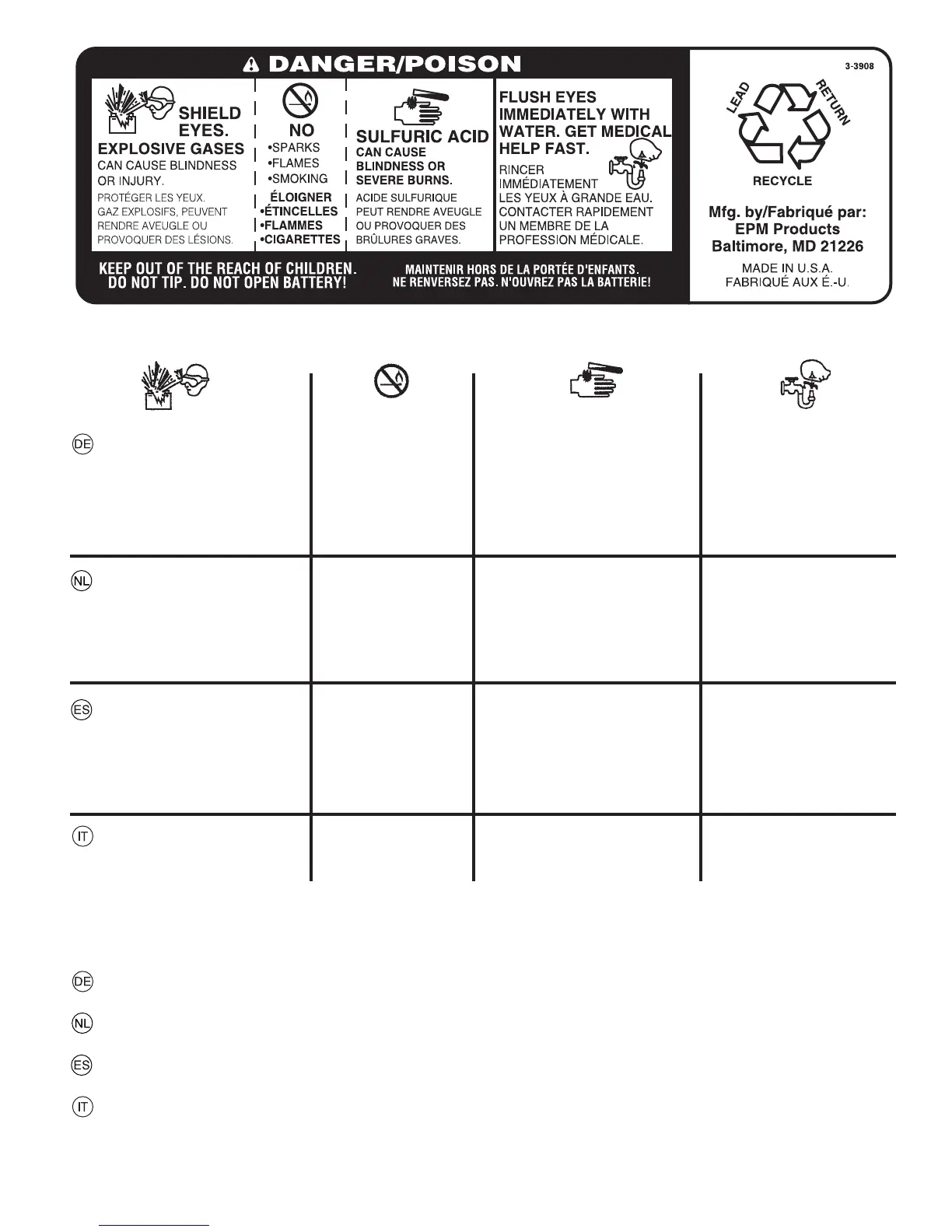 Partner P11597 - Hazard and Warning Symbols; Eye Protection and Explosive Gases; Child Safety and Battery Handling