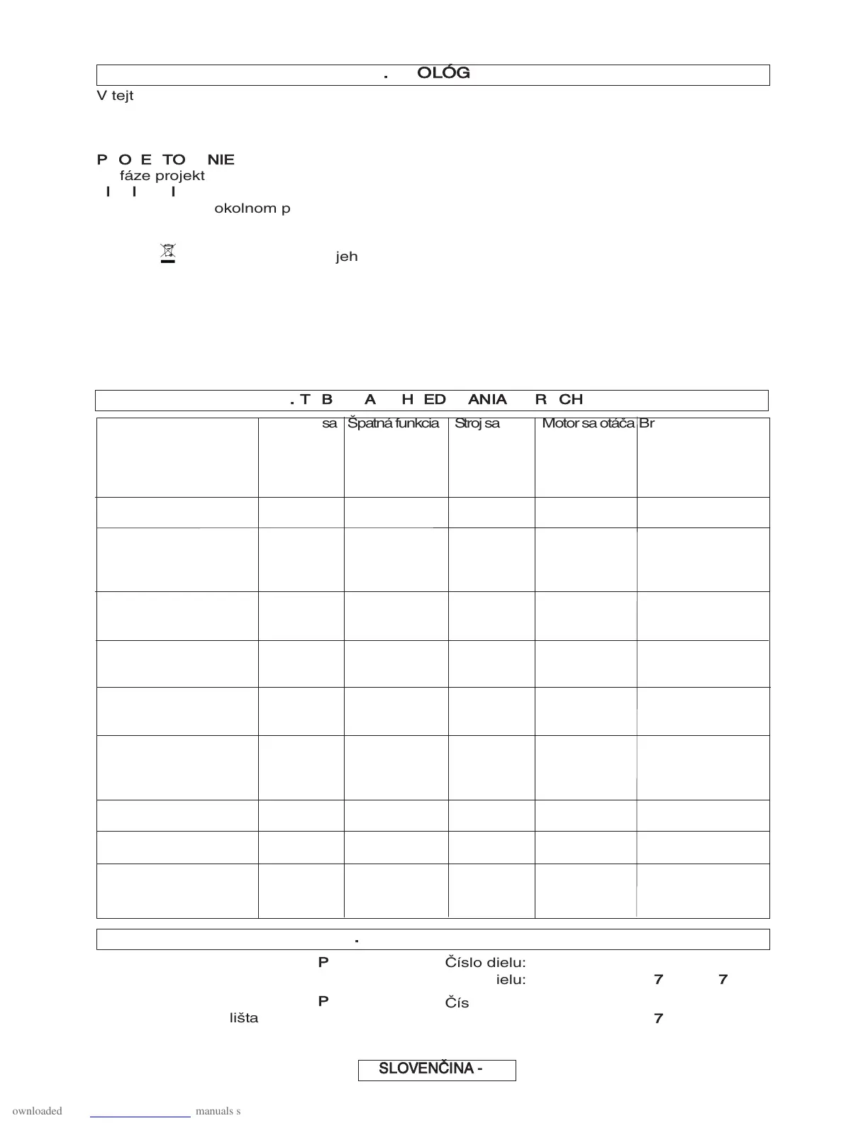 Nespúšťa sa Špatná funkcia Stroj sa Motor sa otáča Brzdné zariadenie