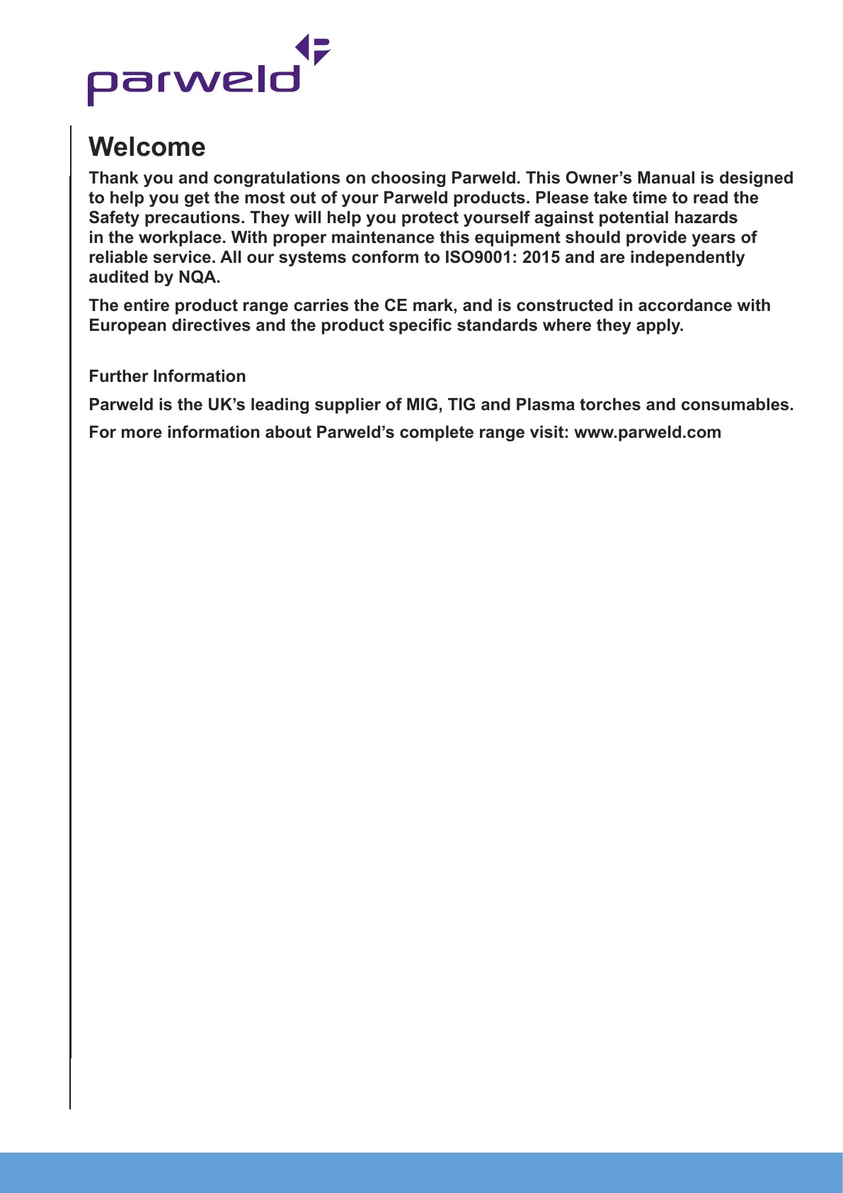 Thank you and congratulations on choosing Parweld. This Owner’s Manual is designed