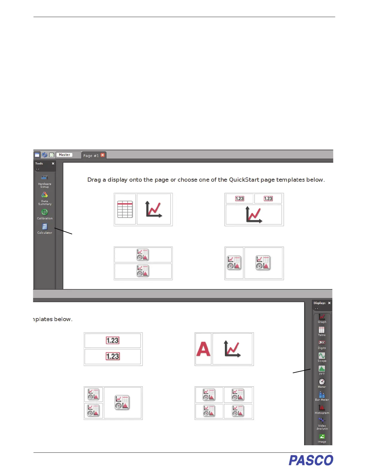 By default, PASCO Capstone shows a “workbook” page with eight pre-configured “QuickStart” page templates
