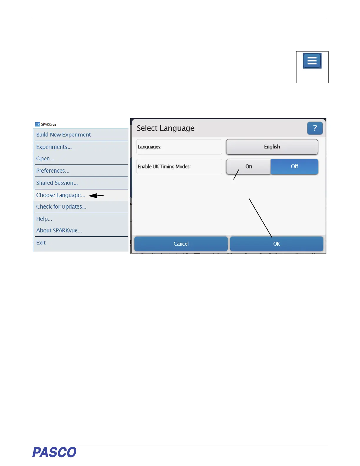 In the SPARKvue menu that opens, select “Choose Language...”. English is the default language