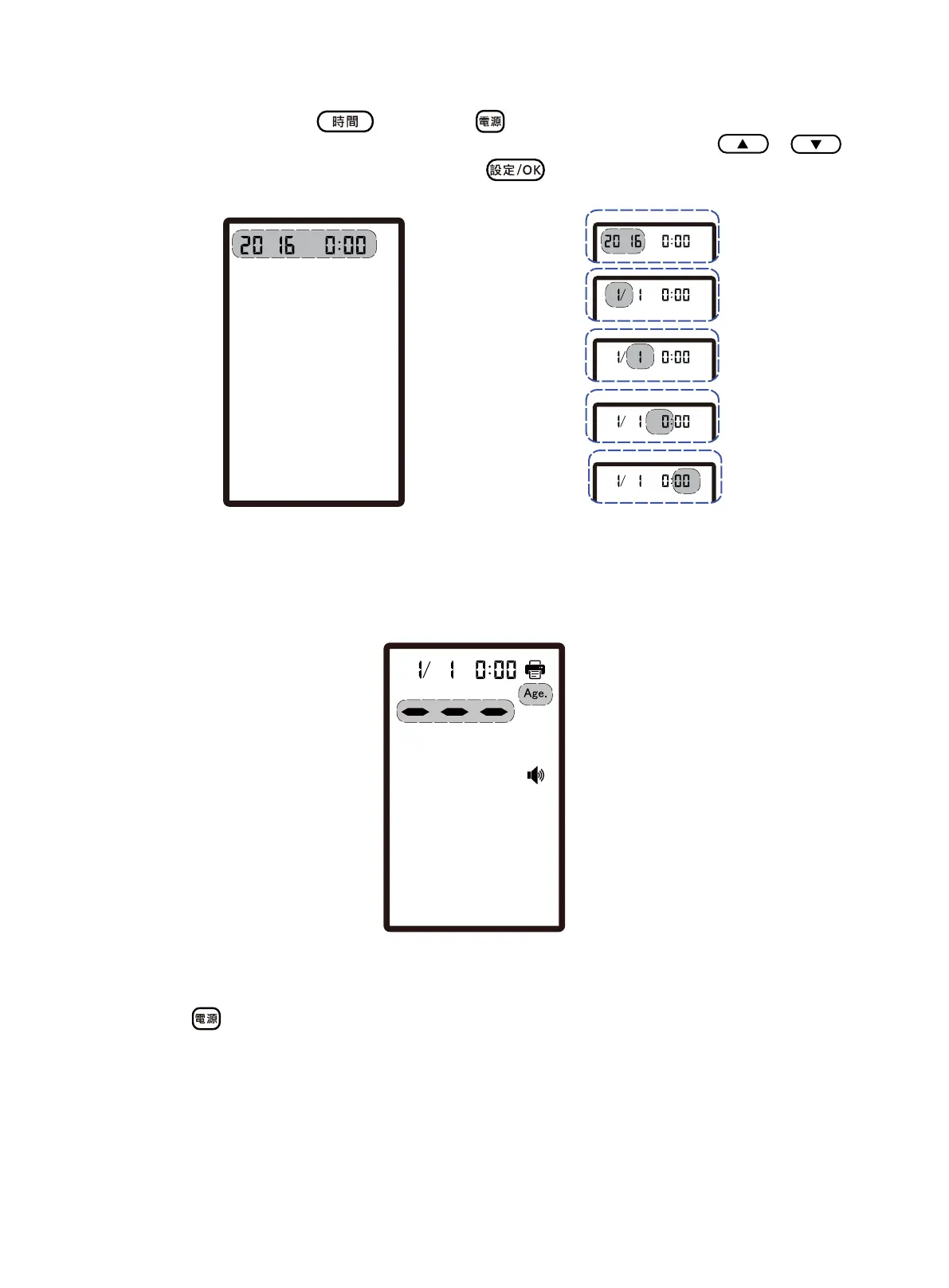 At power-off state, press the button and button simultaneously to enter the date and