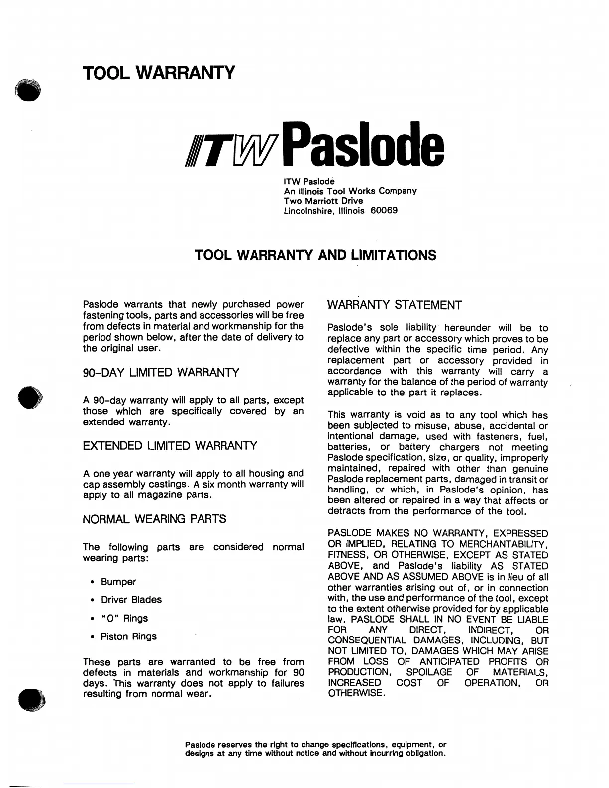 Paslode 3250 - TOOL WARRANTY; Warranty Period; Warranty Statement