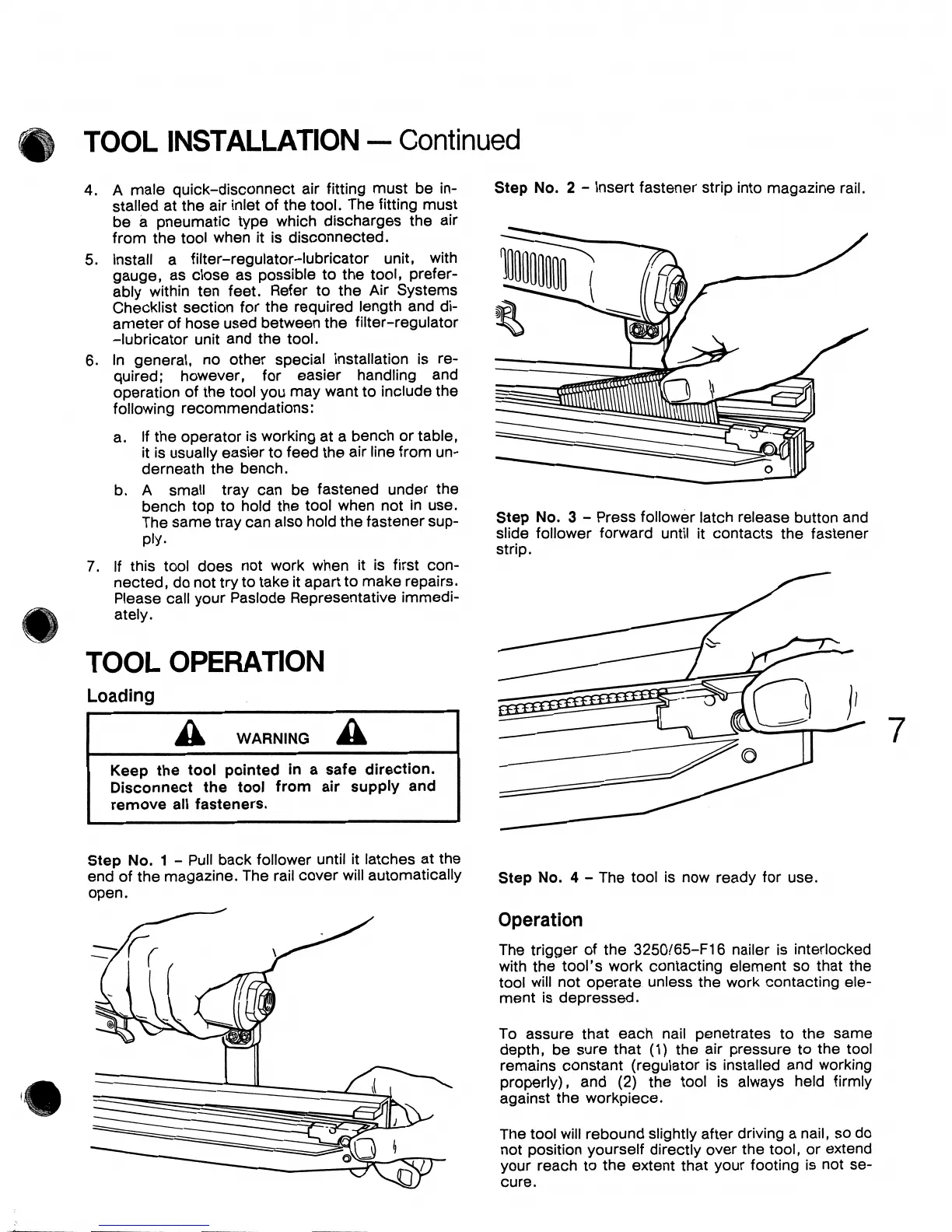 Paslode 3250 - TOOL OPERATION; Loading Fasteners; Operating the Tool