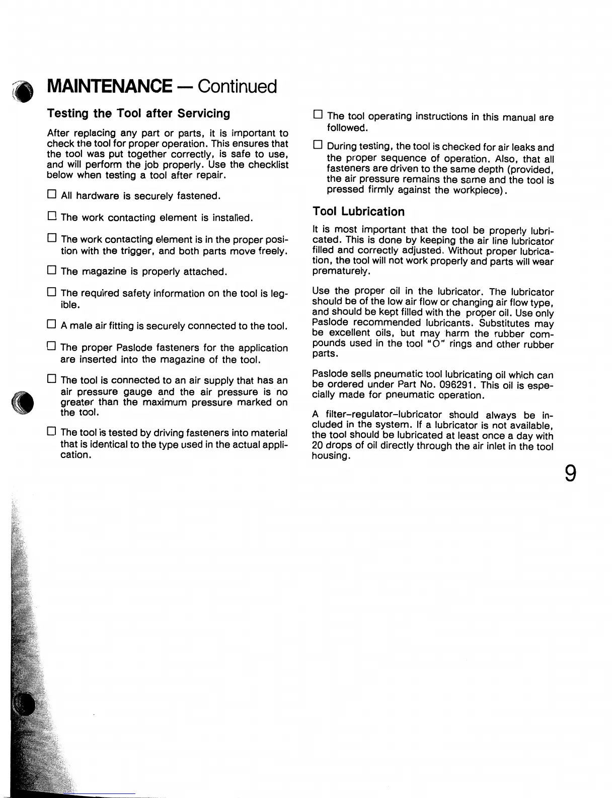 Paslode 3250 - MAINTENANCE; Testing After Servicing; Tool Lubrication