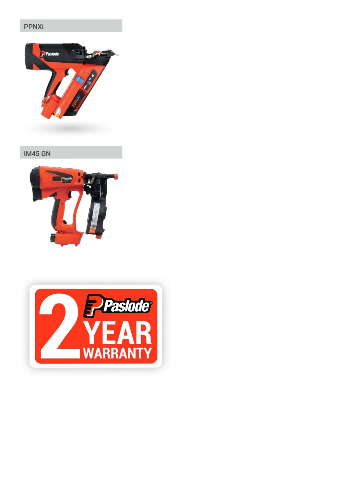 Paslode tools have a standard 2-year warranty, covering all components providing that the Manufacturer’s Operating