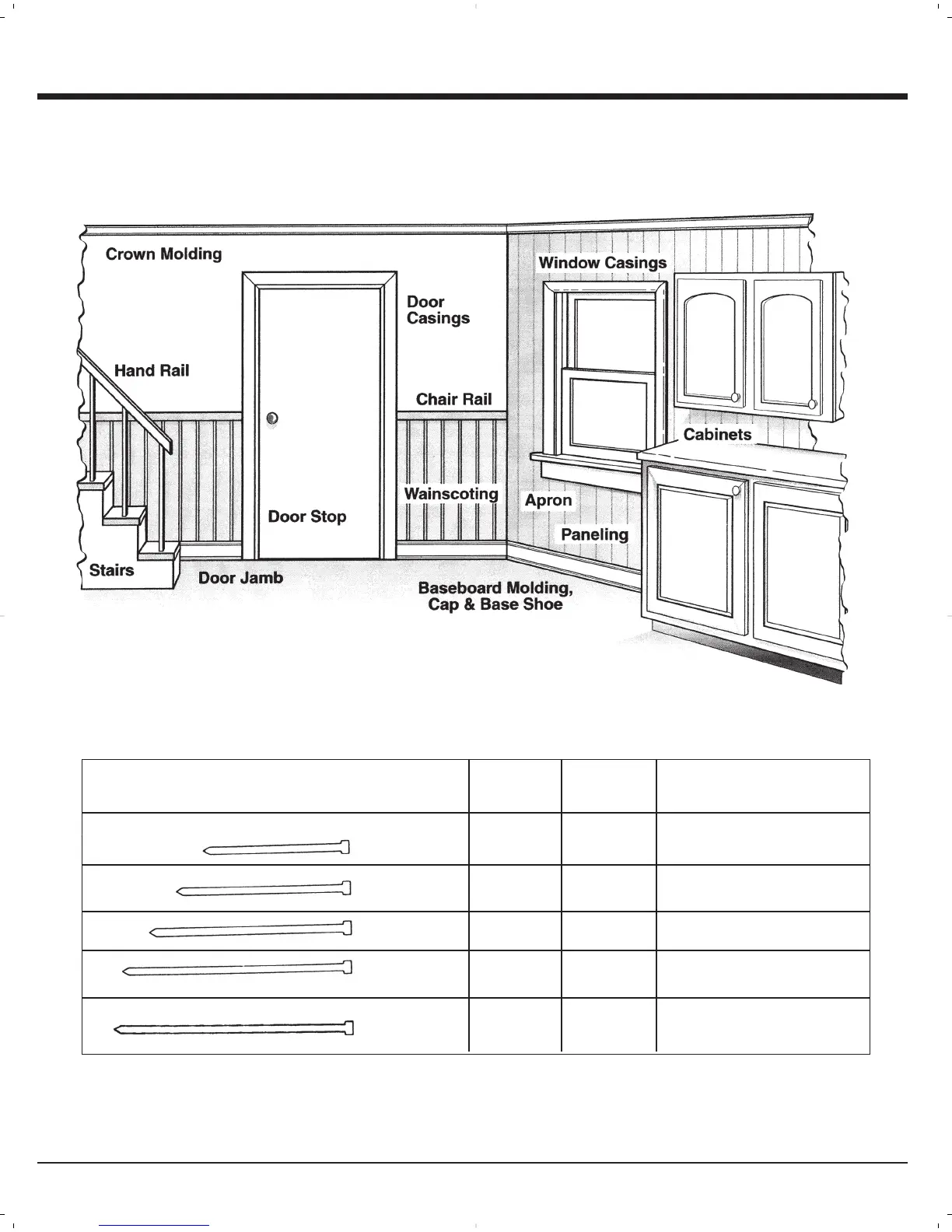 securing paneling; securing chair rails, picture molding and other decorative trim.