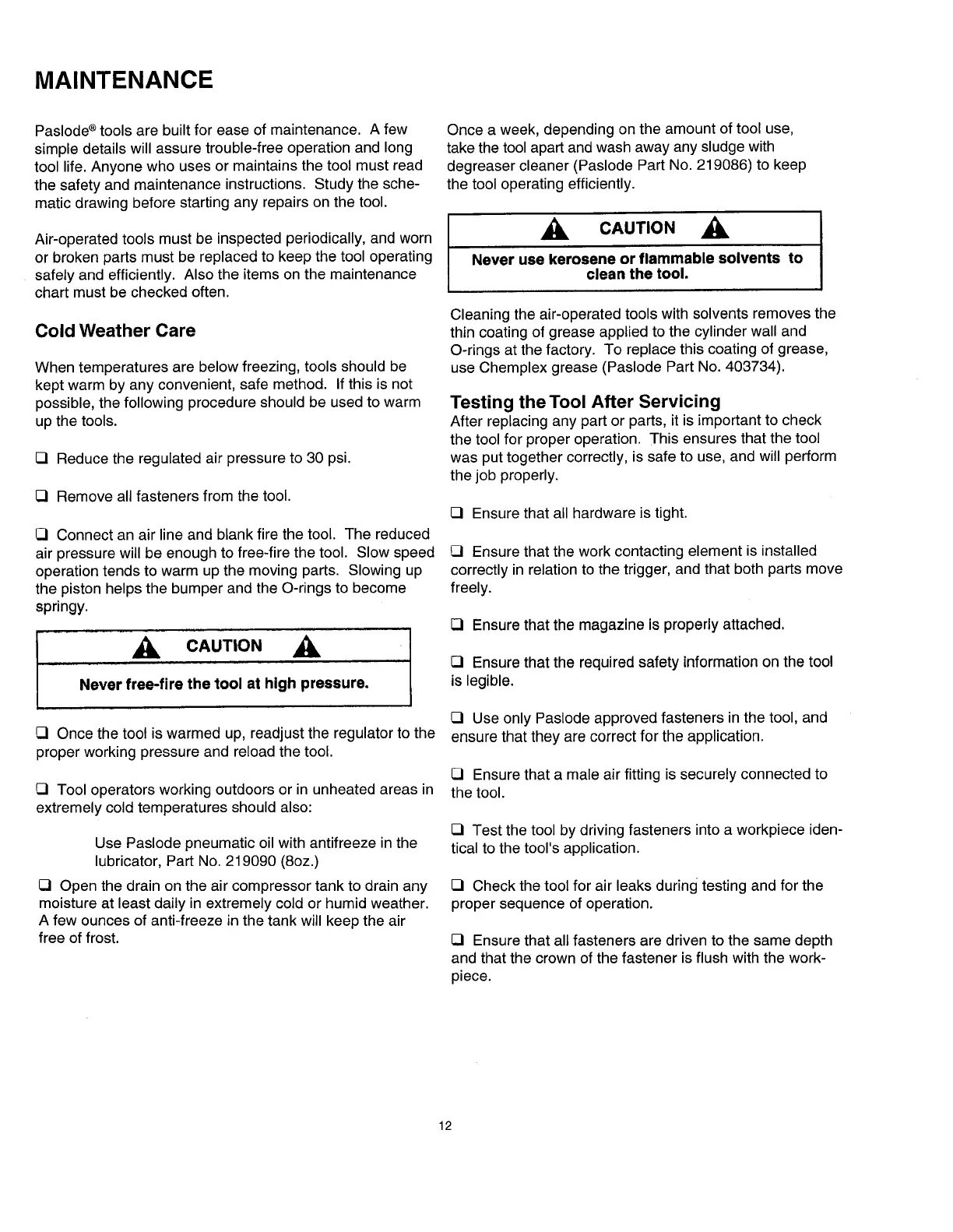 Paslode CS150 - MAINTENANCE; Cold Weather Care; Testing the Tool After Servicing