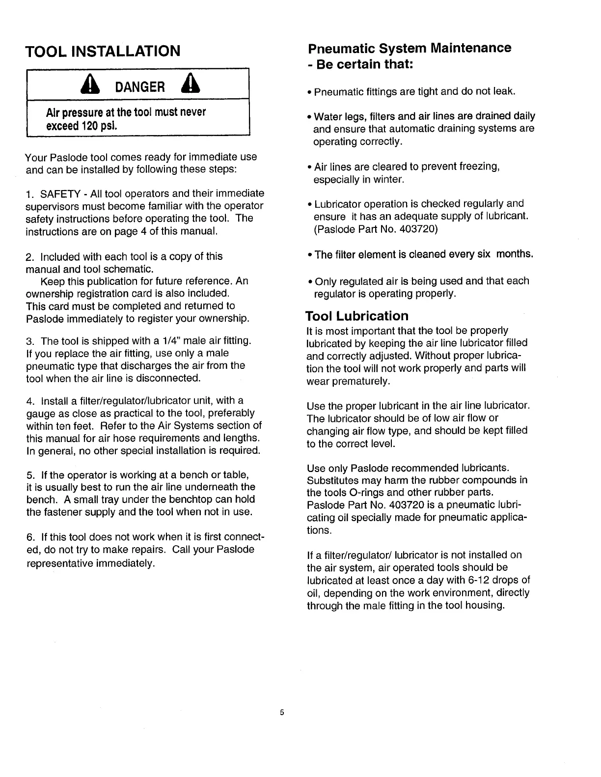 Paslode CS150 - TOOL INSTALLATION; Pneumatic System Maintenance; Tool Lubrication