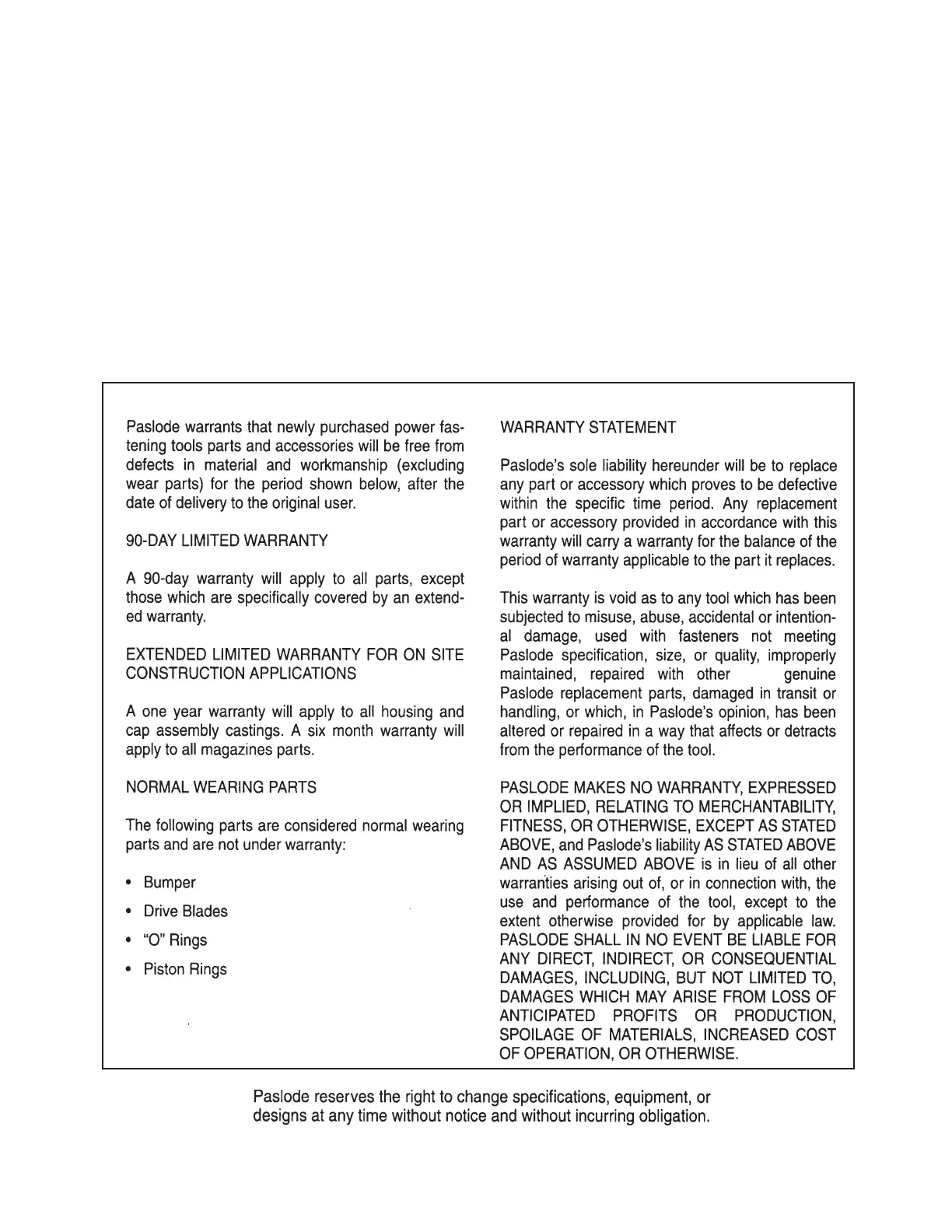 Paslode F150S-PP - Tool Warranty; Warranty Statement