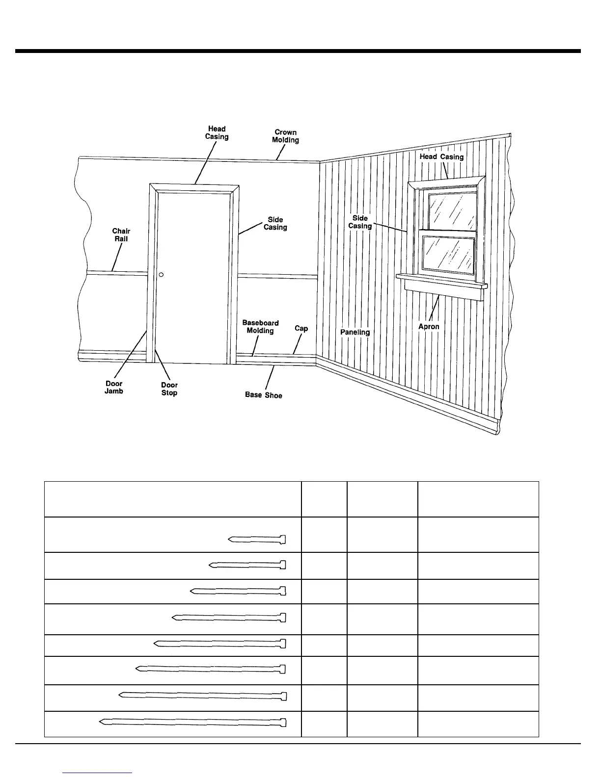 securing paneling; securing chair rails, picture molding and other decorative trim.