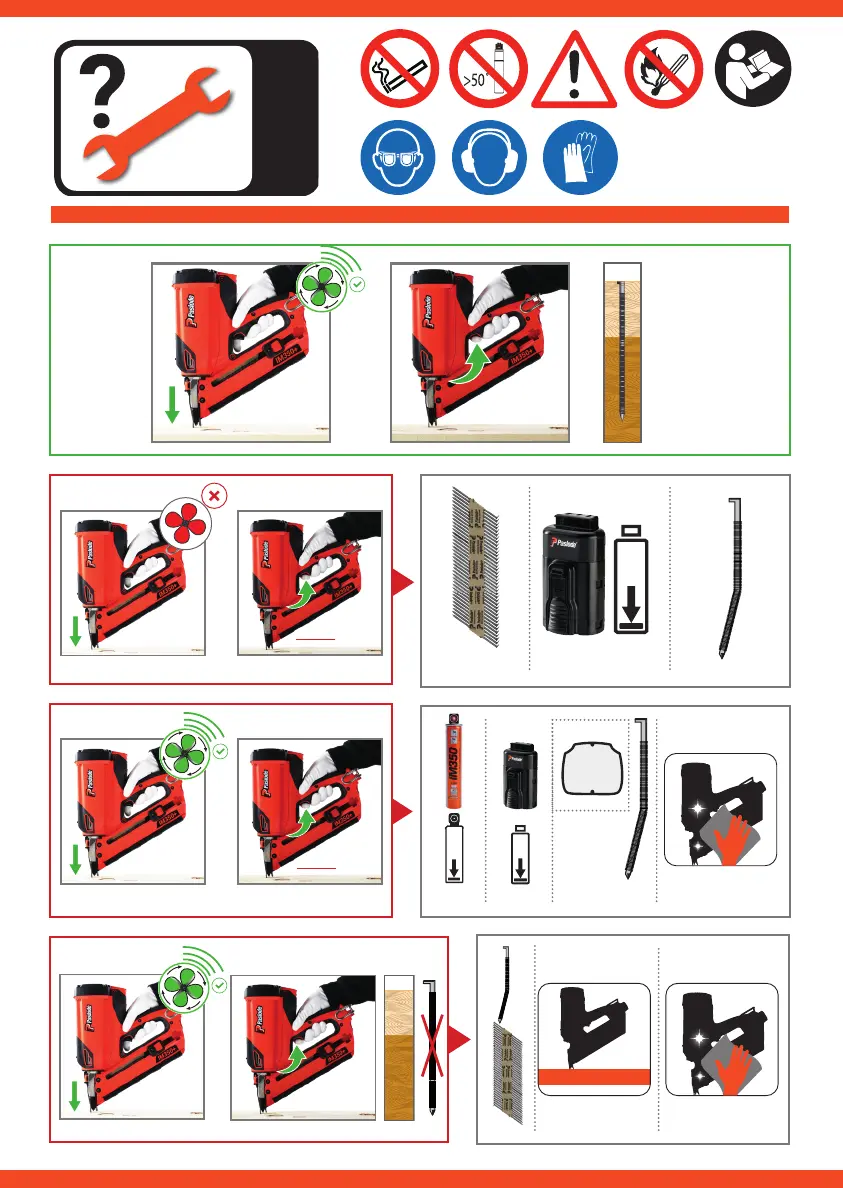 Paslode IM350+ - Troubleshooting and Best Practices; Correct Nailing Technique Examples; Identifying and Avoiding Nailing Errors; Accessory and Part Identification