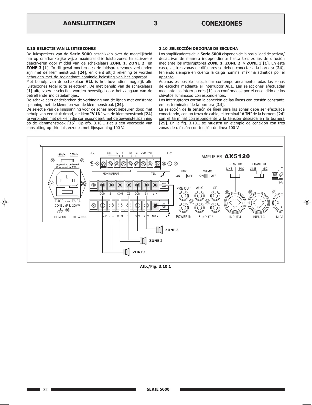 aansluiting op drie luisterzones met lijnspanning 100 V.