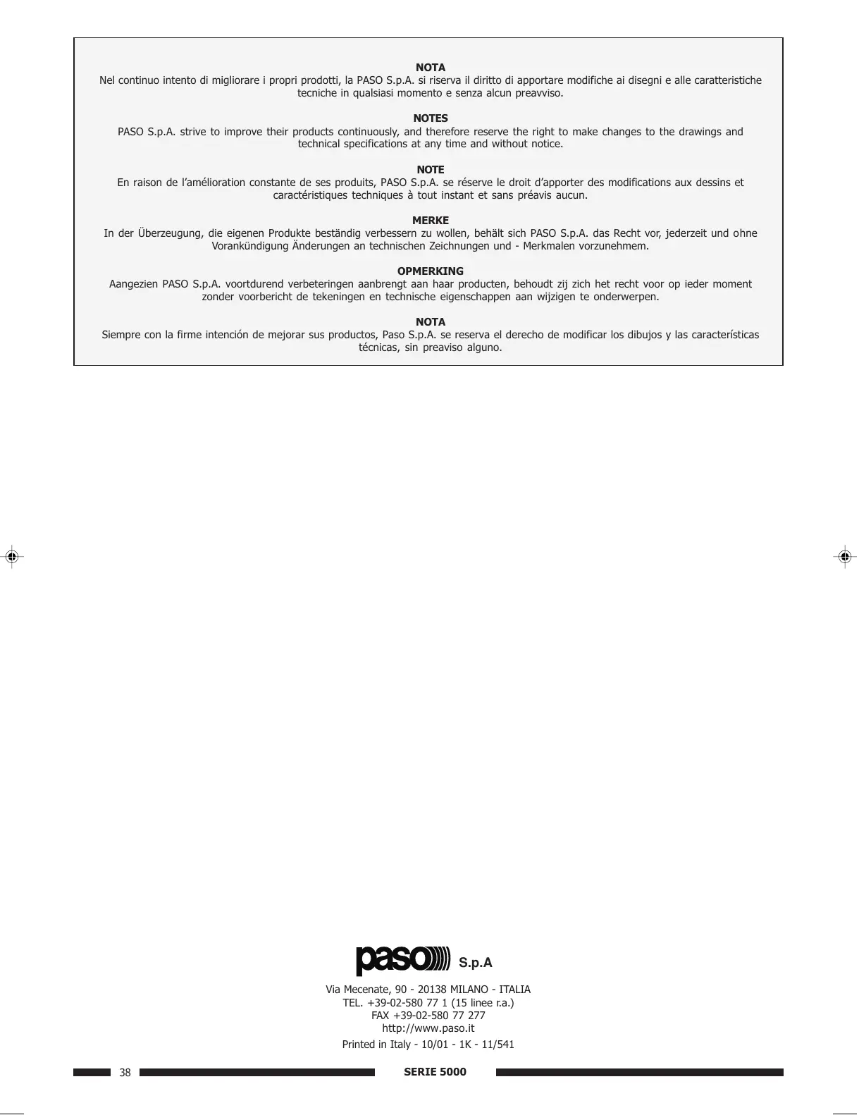 Nel continuo intento di migliorare i propri prodotti, la PASO S.p.A. si riserva il diritto di apportare modifiche ai disegni e alle caratteristiche