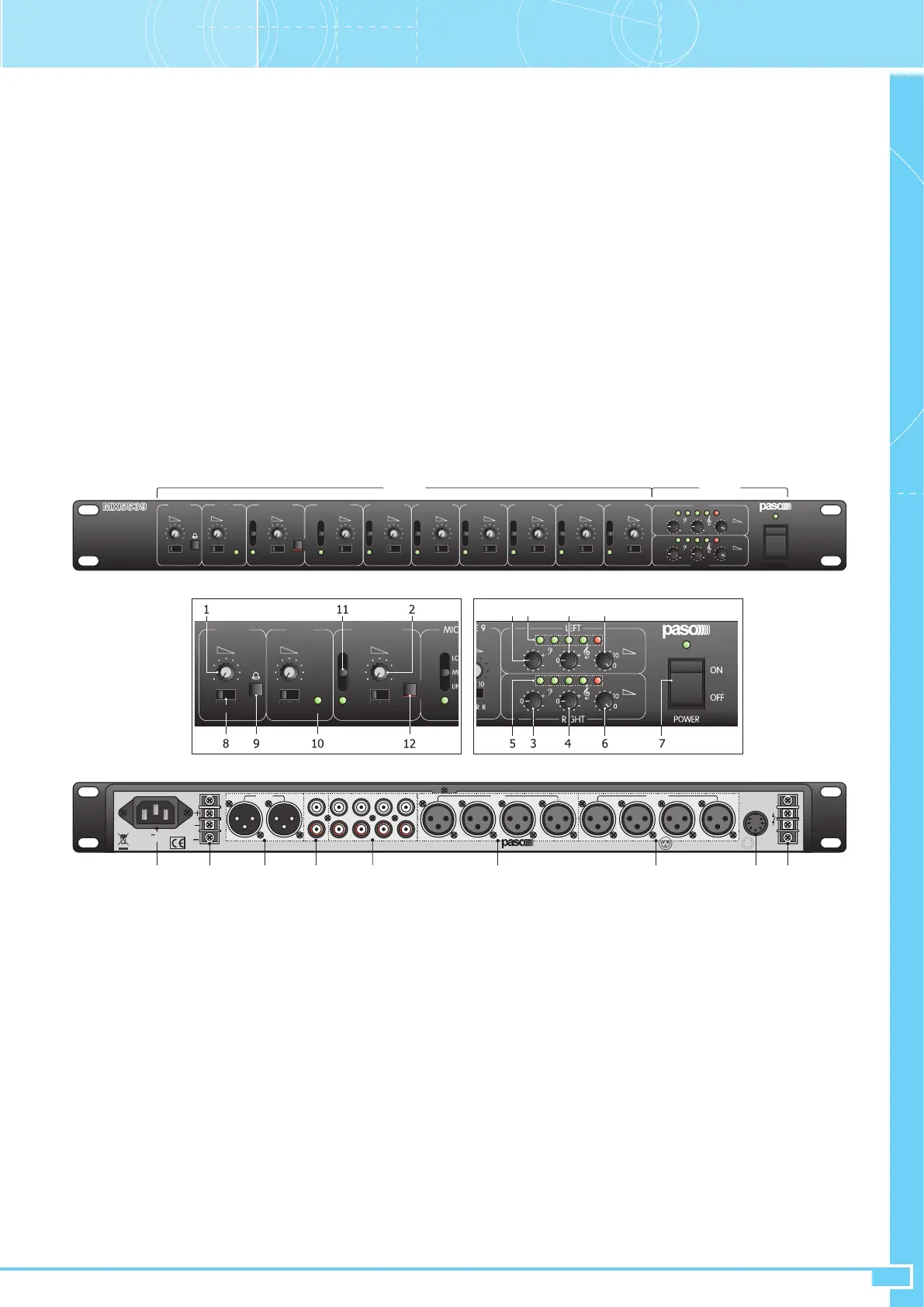 • 9 ingangskanalen met selecteerbare gevoeligheid (microfoon of lijn).