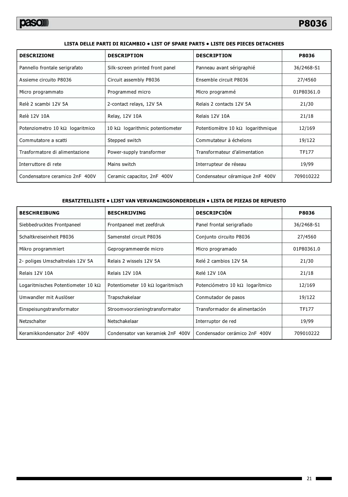 LISTA DELLE PARTI DI RICAMBIO LIST OF SPARE PARTS LISTE DES PIECES DETACHEES