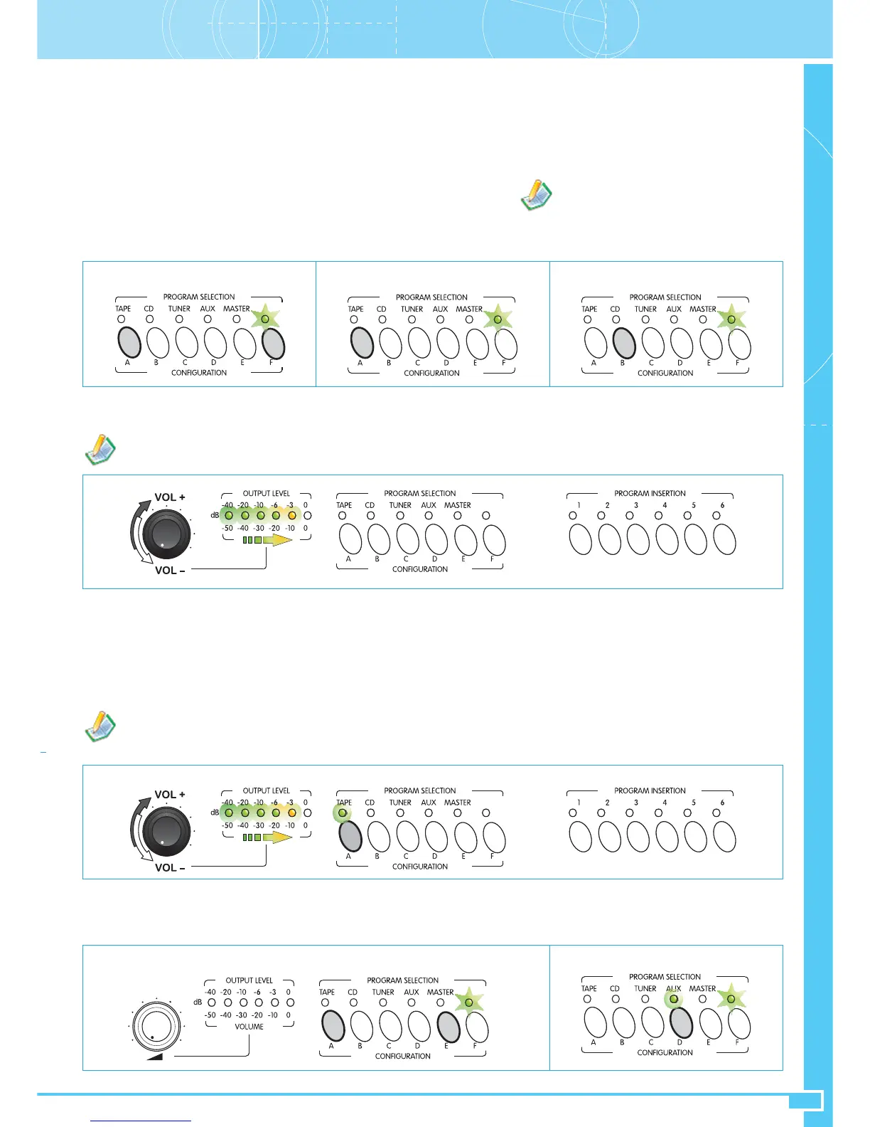 La selezione di una delle sorgenti TAPE – CD – TUNER – AUX è riferita alla sorgente collegata alle prese di INGRESSO MUSICA (32); la selezione della