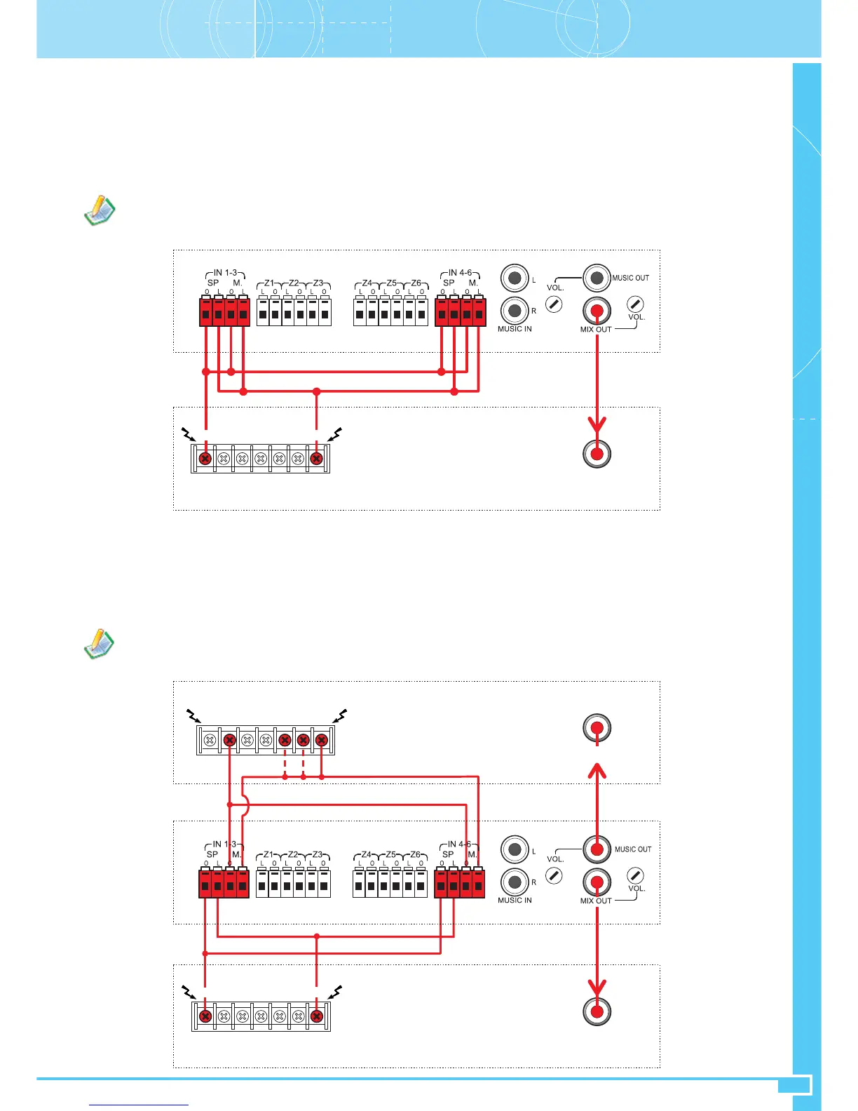 Collegare la presa di uscita MIX OUT (27) all’ingresso di linea dell’amplificatore per segnale VOCE e la presa di uscita MUSIC OUT (26) all’ingresso