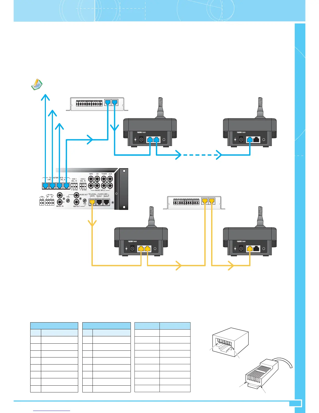 Le postazioni microfoniche e le schede ACIO8136 sono connesse tra loro in cascata con cavo CAT.5 SF/UTP sull’ingresso TO MASTER UNITS (24).
