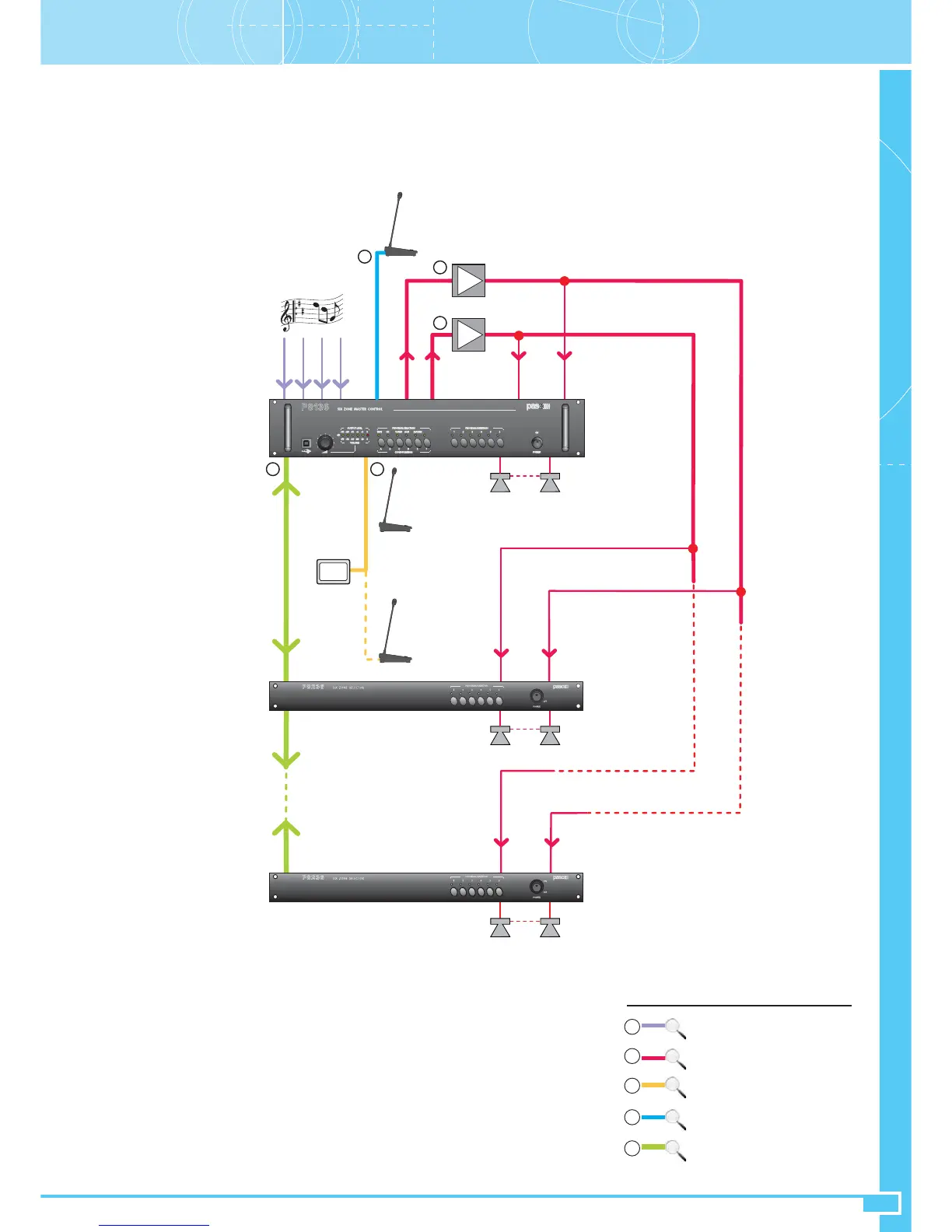 This configuration is similar to that illustrated under point 5.1 above, with the addition of a dedicated amplifier for broadcasting background music.
