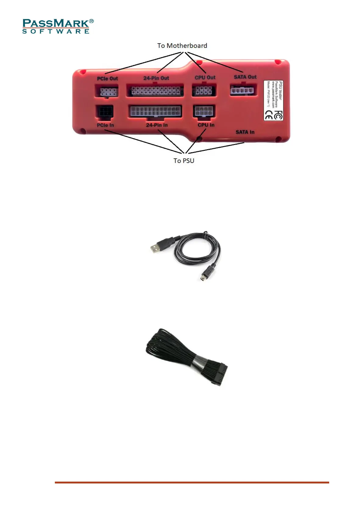 PassMark PM123 - Included Cables and Connections; USB Connection Cable Details; 24-Pin Motherboard Cable Details; CPU Power Cable Details